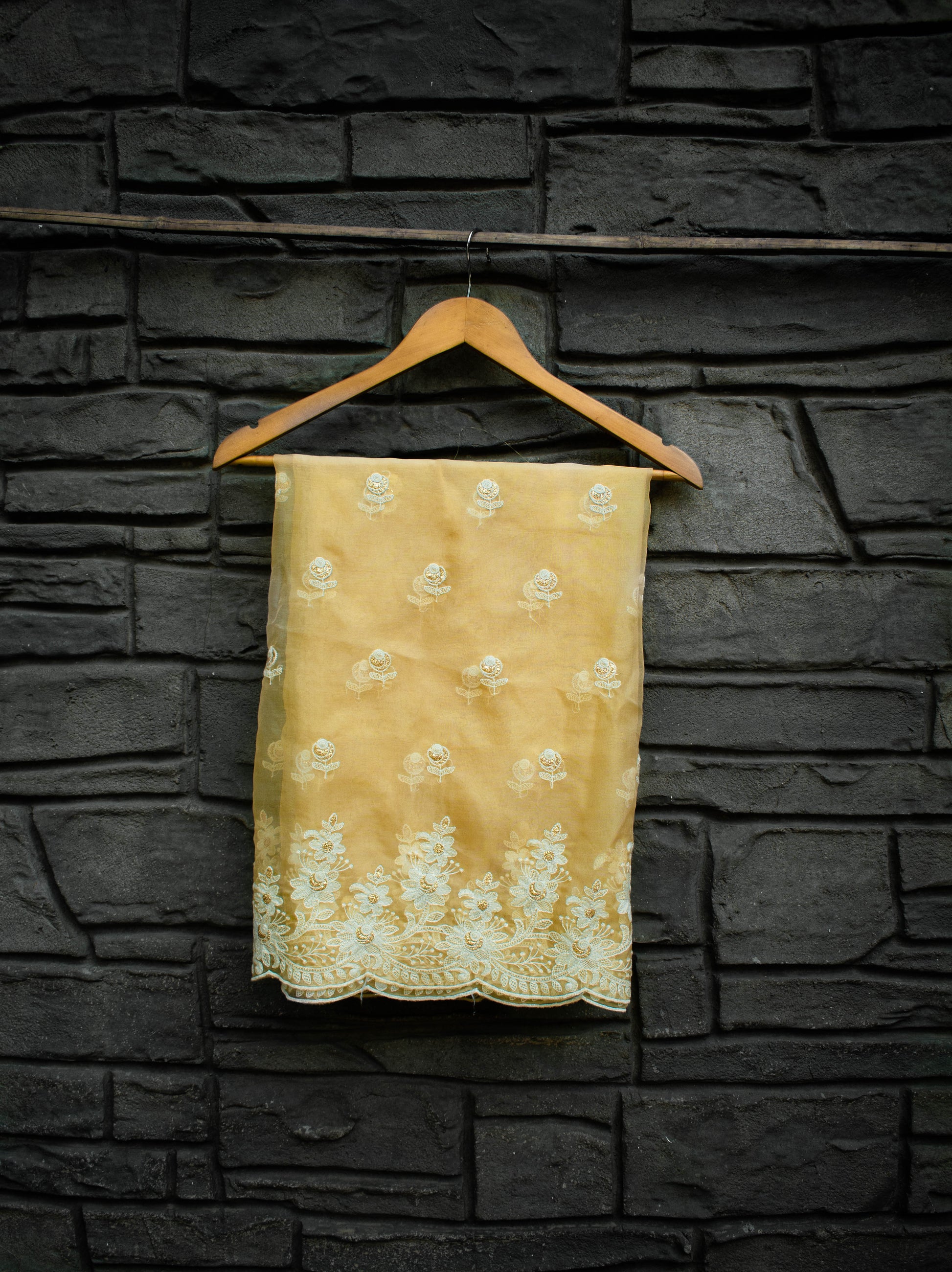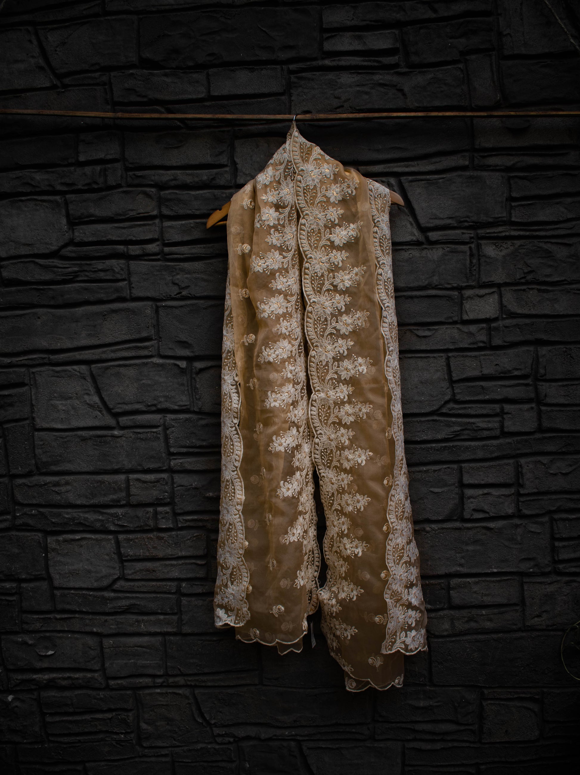 Absolutely gorgeous organza dupatta with all over-embroidery and scalloped edges. For those who are royalty. Understated but opulent.