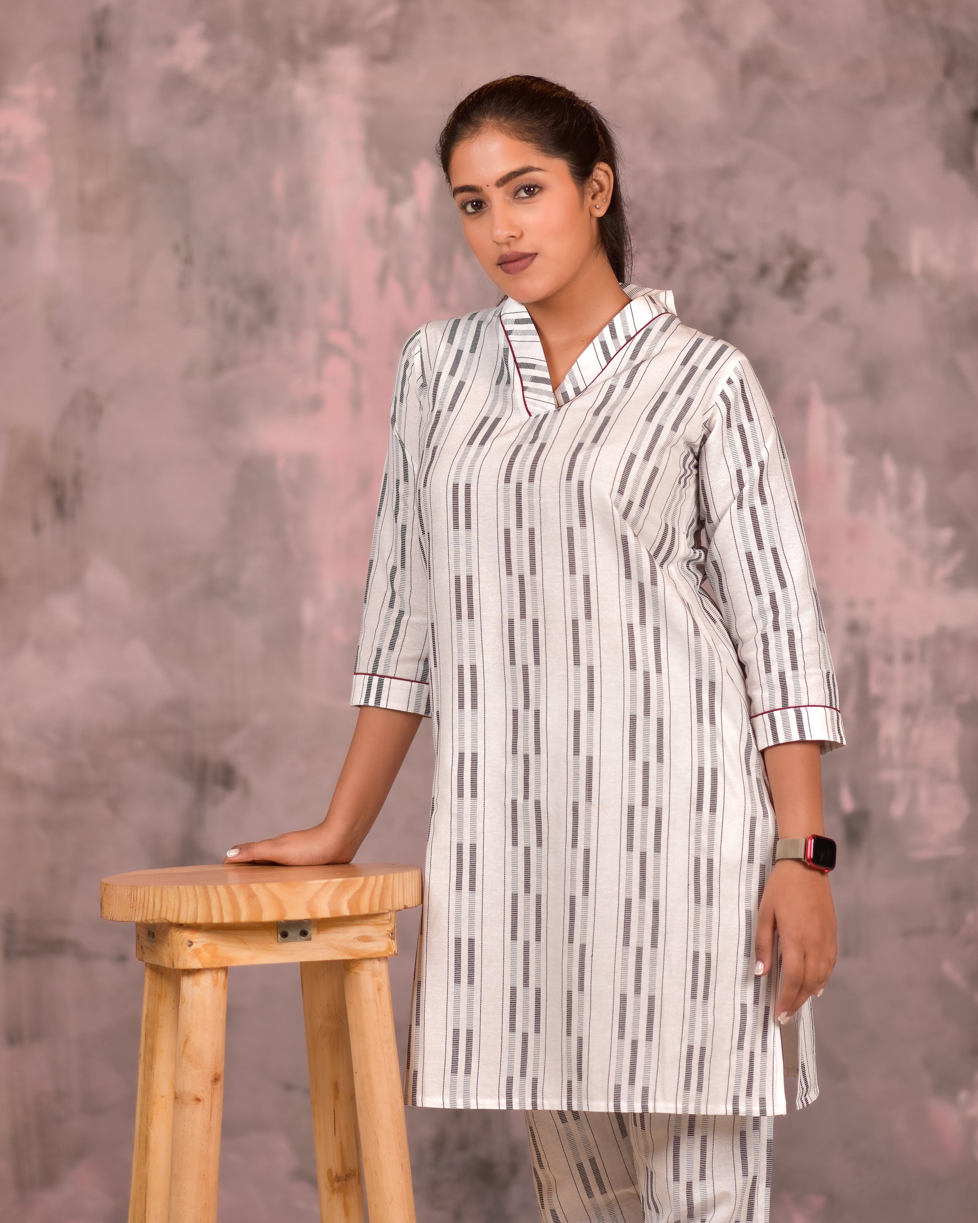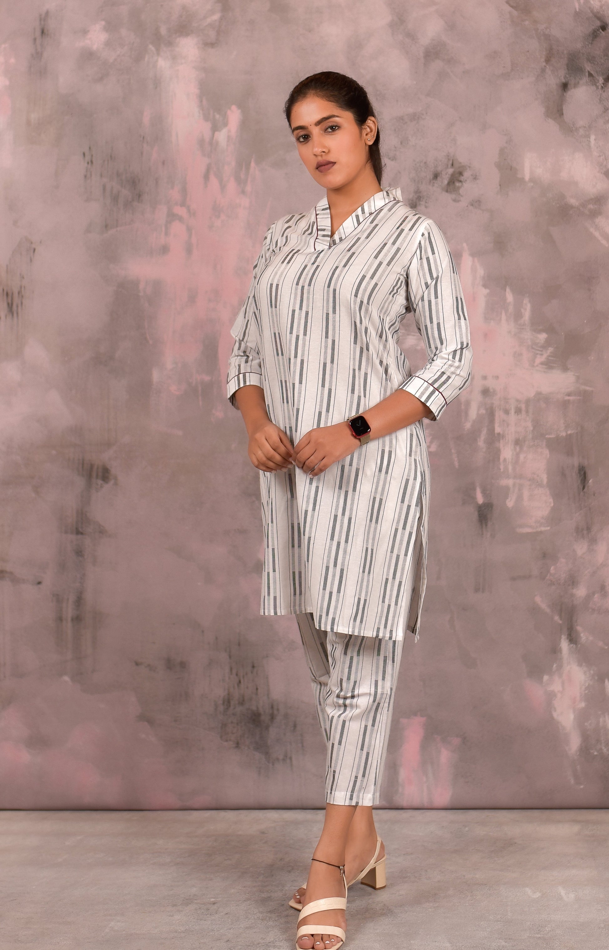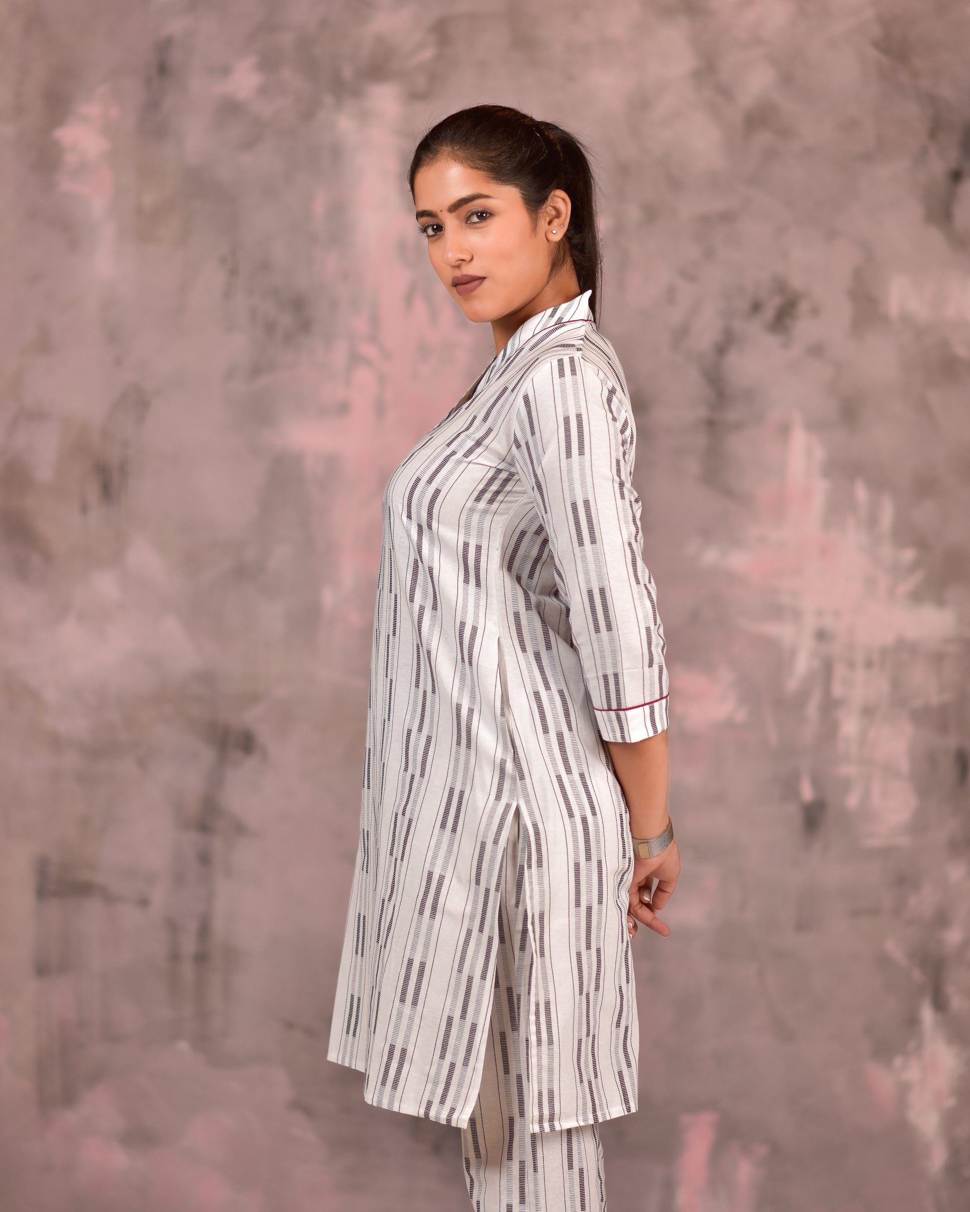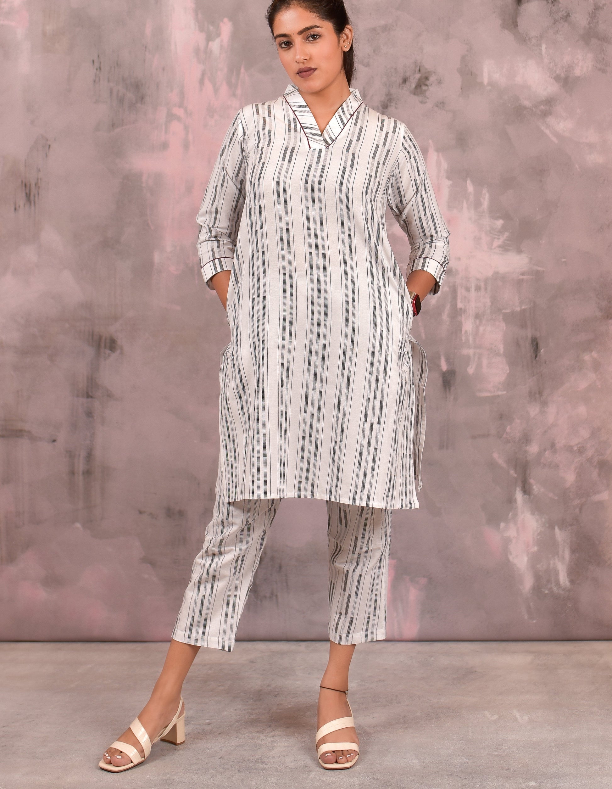 A gorgeous white black handloom woven co-ord set for that chic look. This set of 2 is made in 100% cotton and is super comfortable to wear.