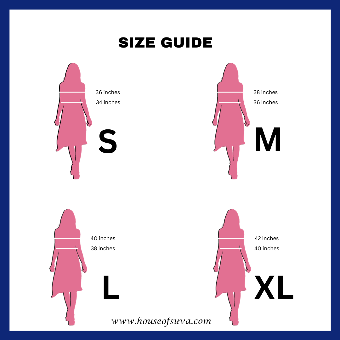 Below are the body measurements. For Chest & hip measure at the highest point and for top/kurta's waist measure at your natural waistline below bust. Bottoms have comfortable elastic.