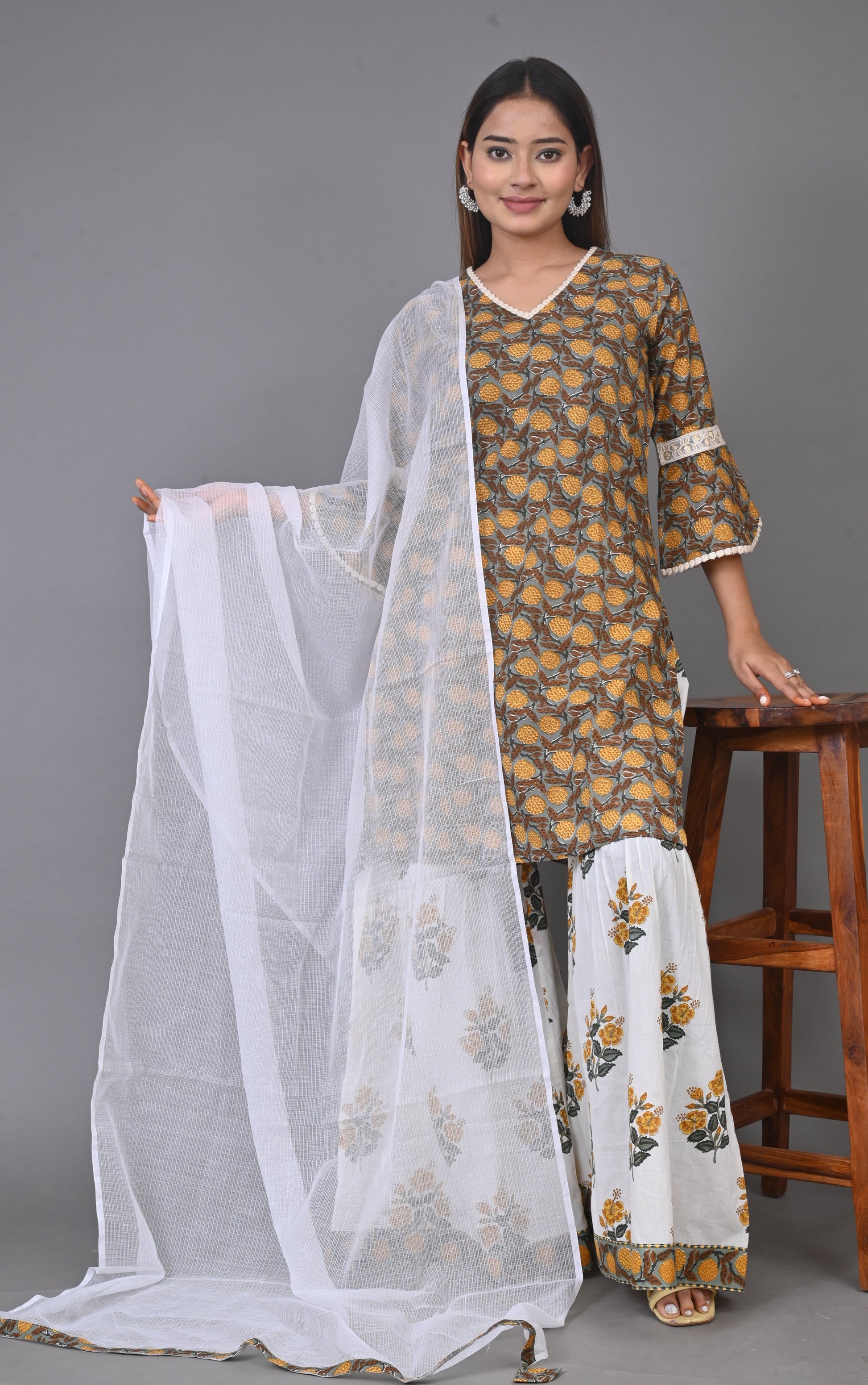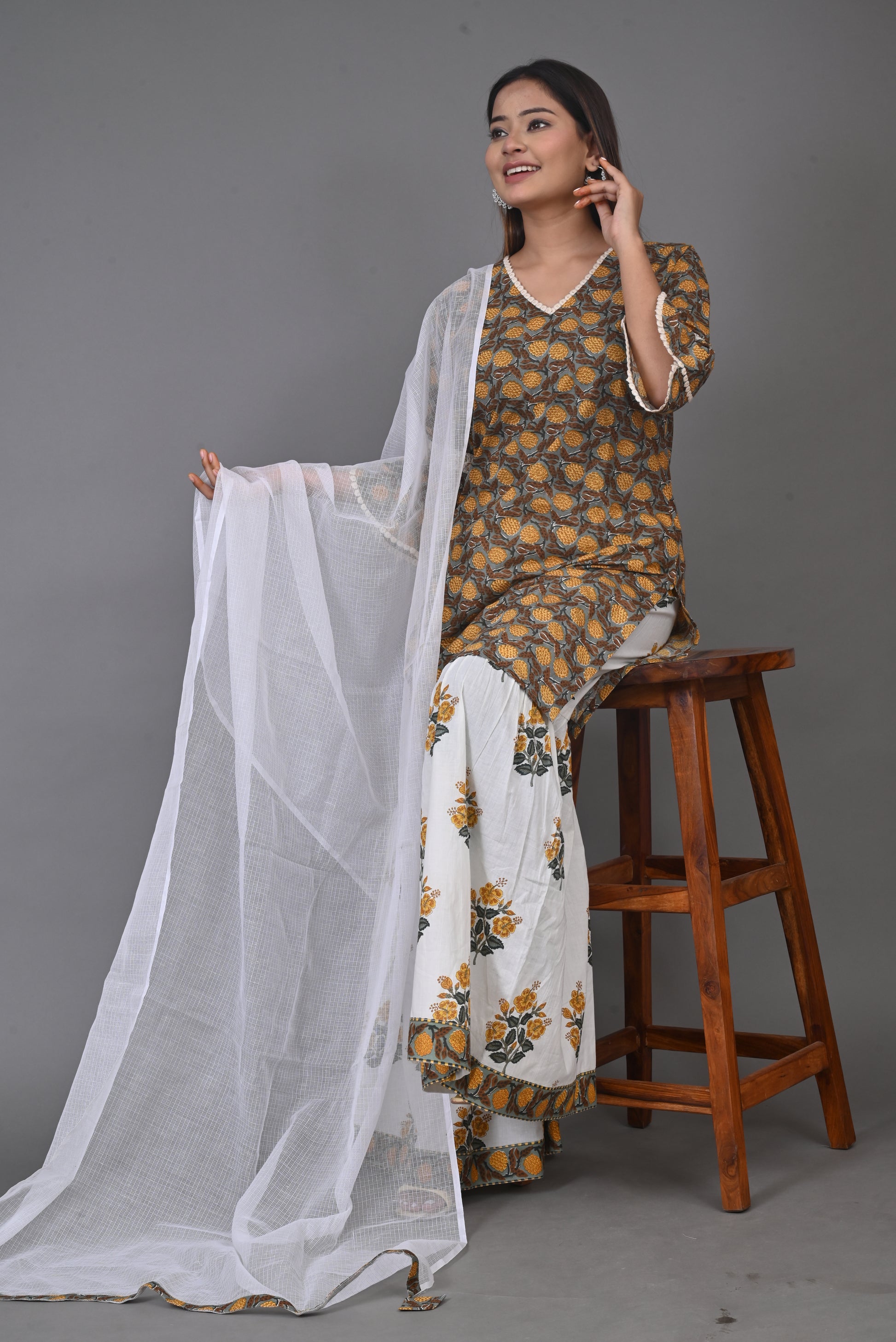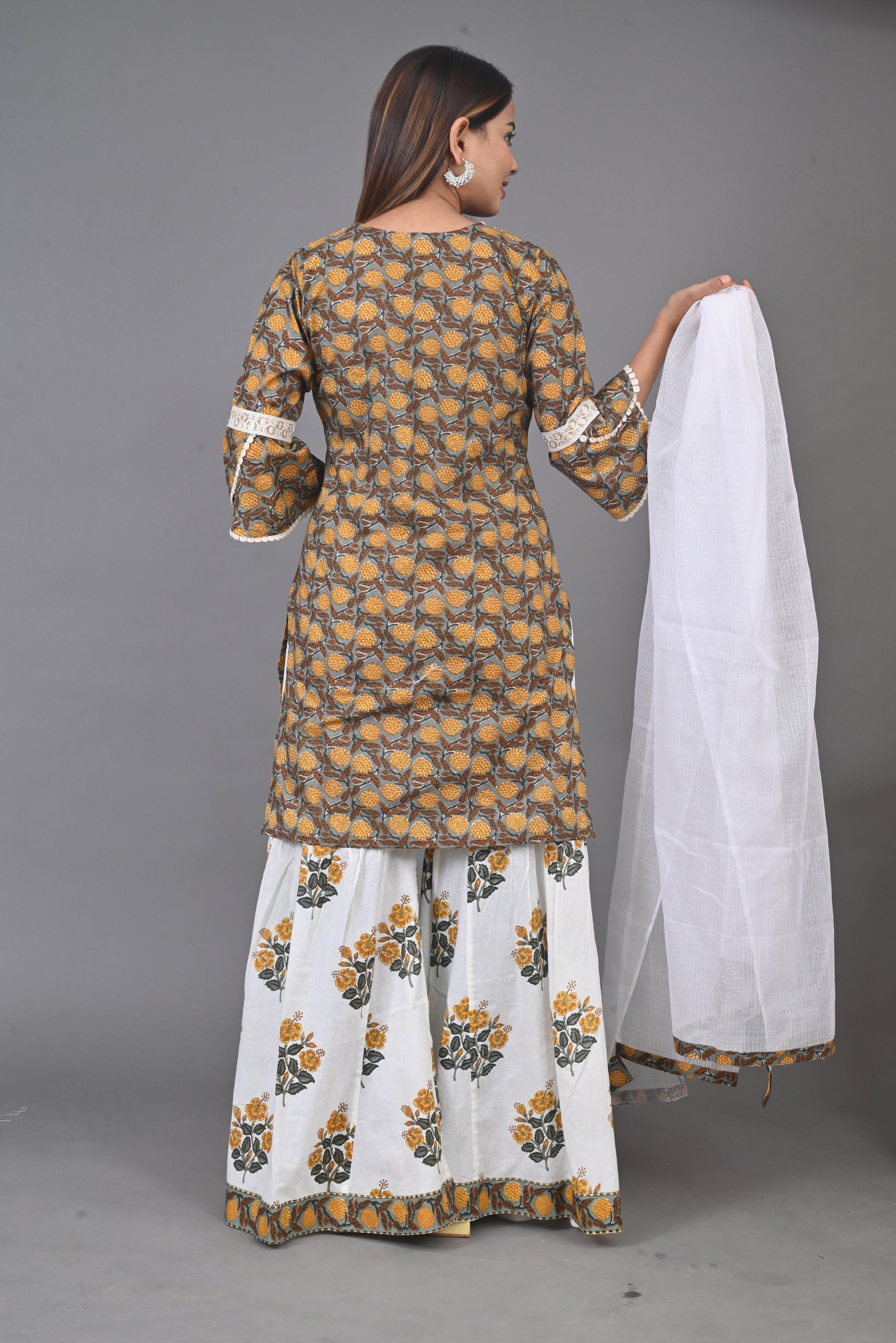 Fully handmade this set is made with block printed fabric in a modern style top and gharara style bottom. The set is complemented with a kota doria dupatta.