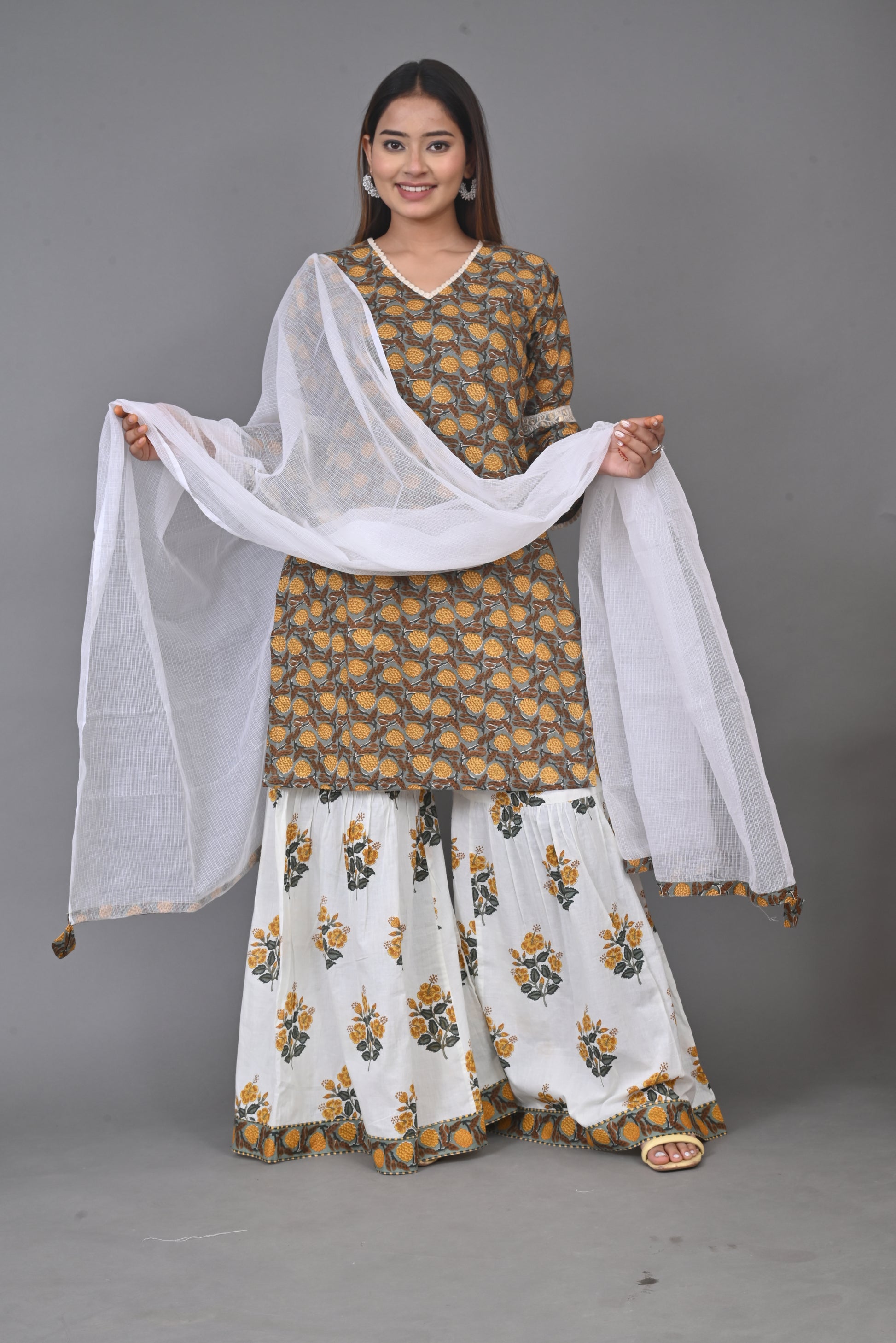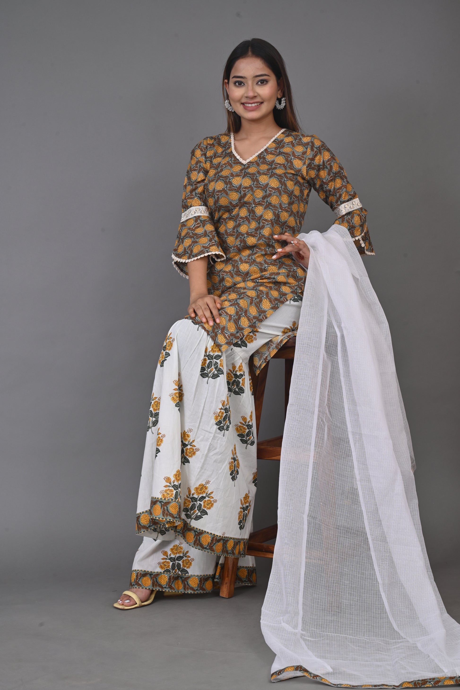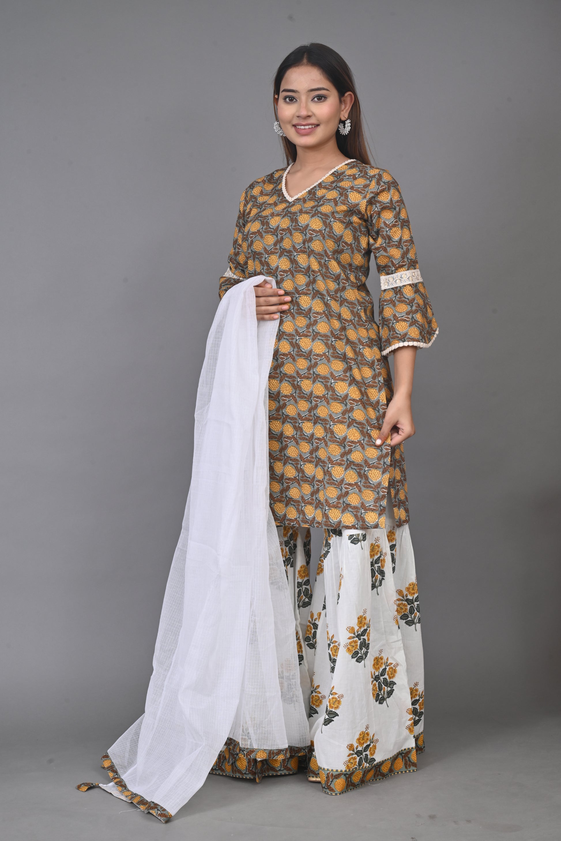 Fully handmade this set is made with block printed fabric in a modern style top and gharara style bottom. The set is complemented with a kota doria dupatta.