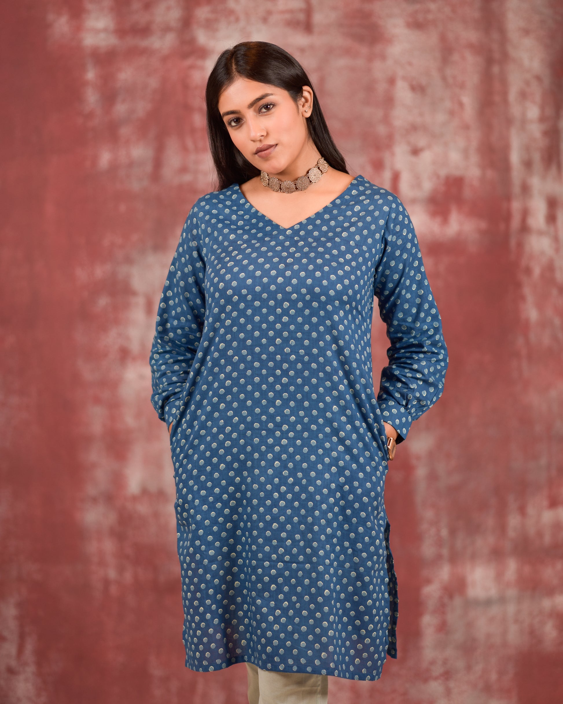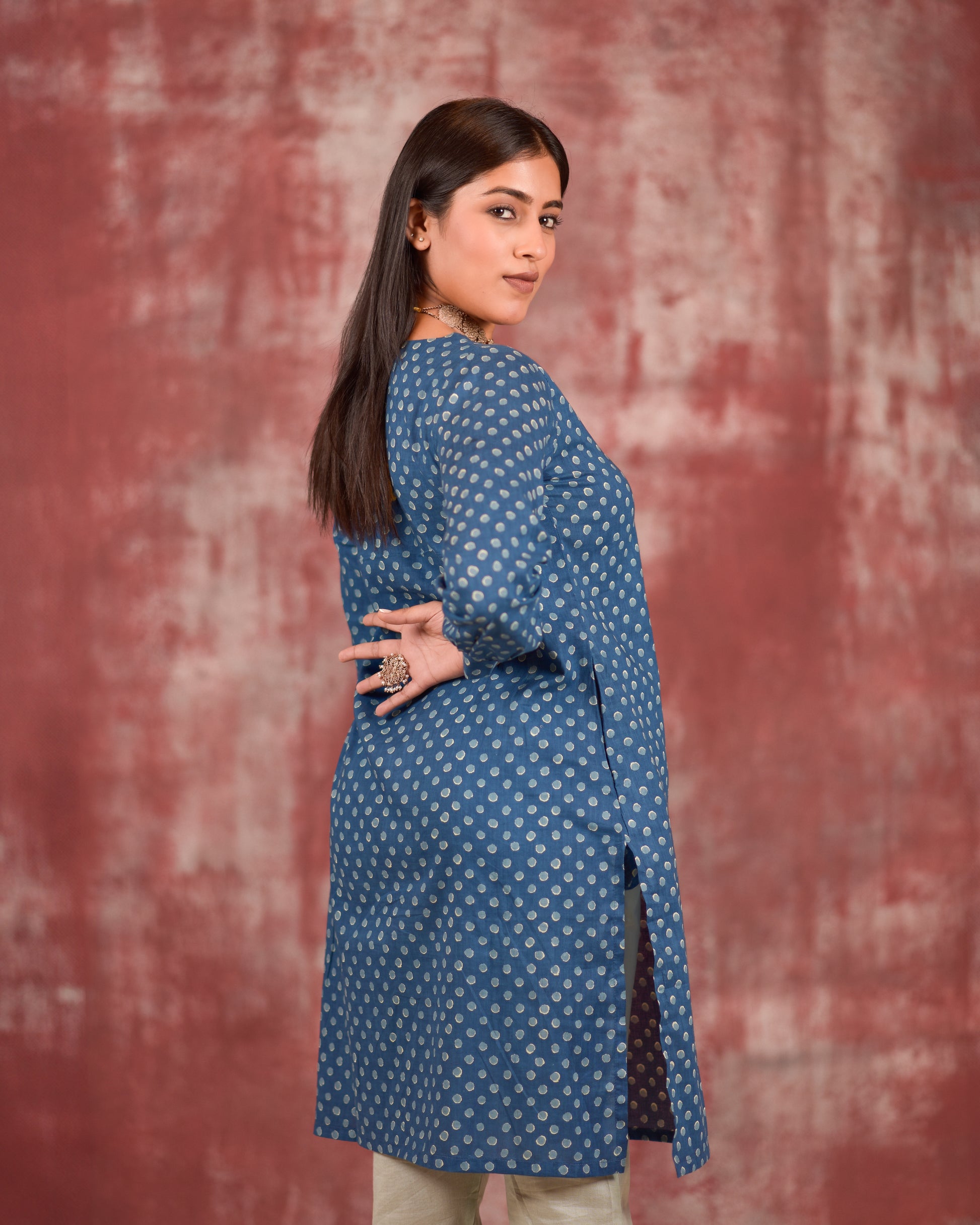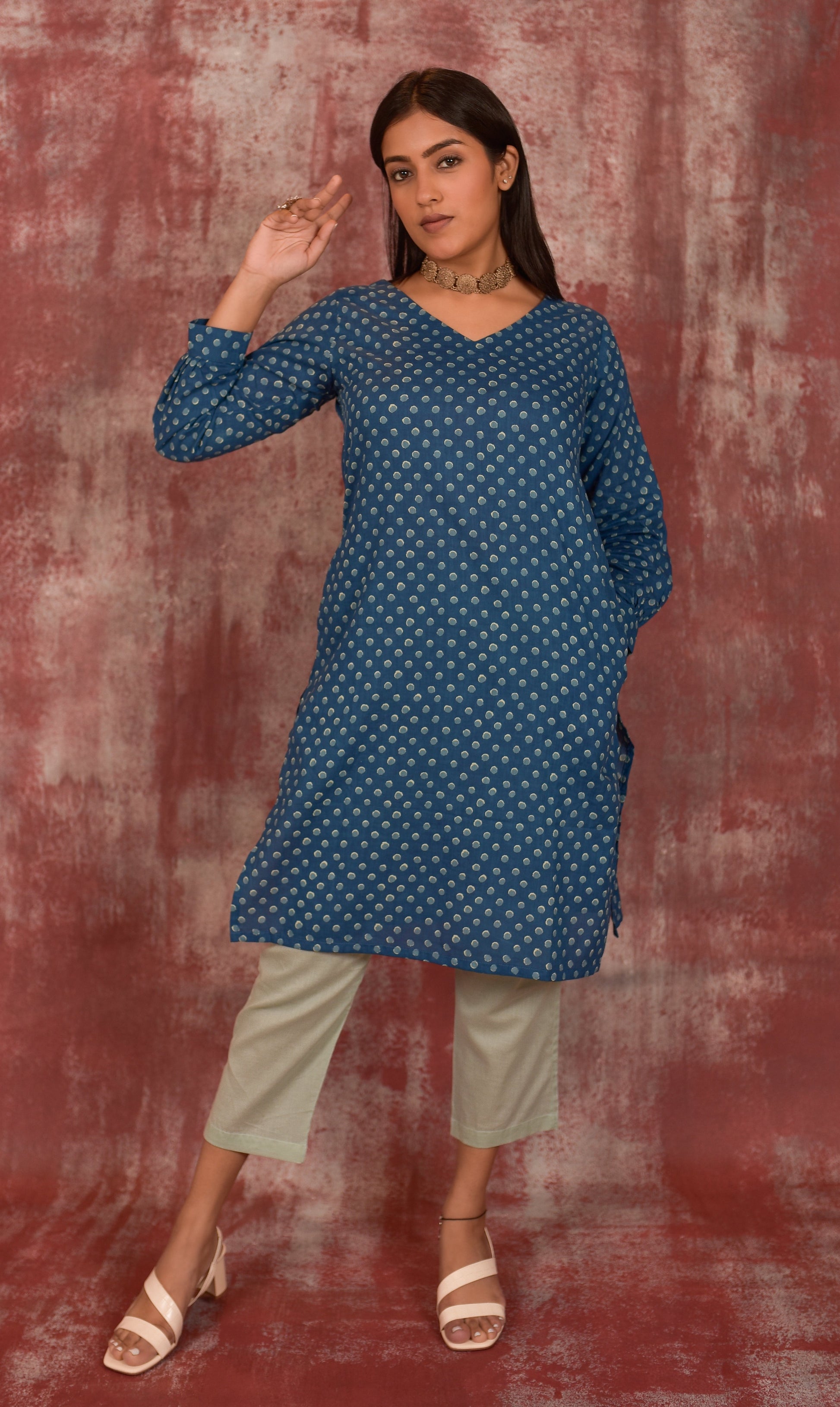 A gorgeous blue block printed co-ord set for your pre-festivite celebrations. This set of 2 is made in 100% cotton and is super comfortable to wear.