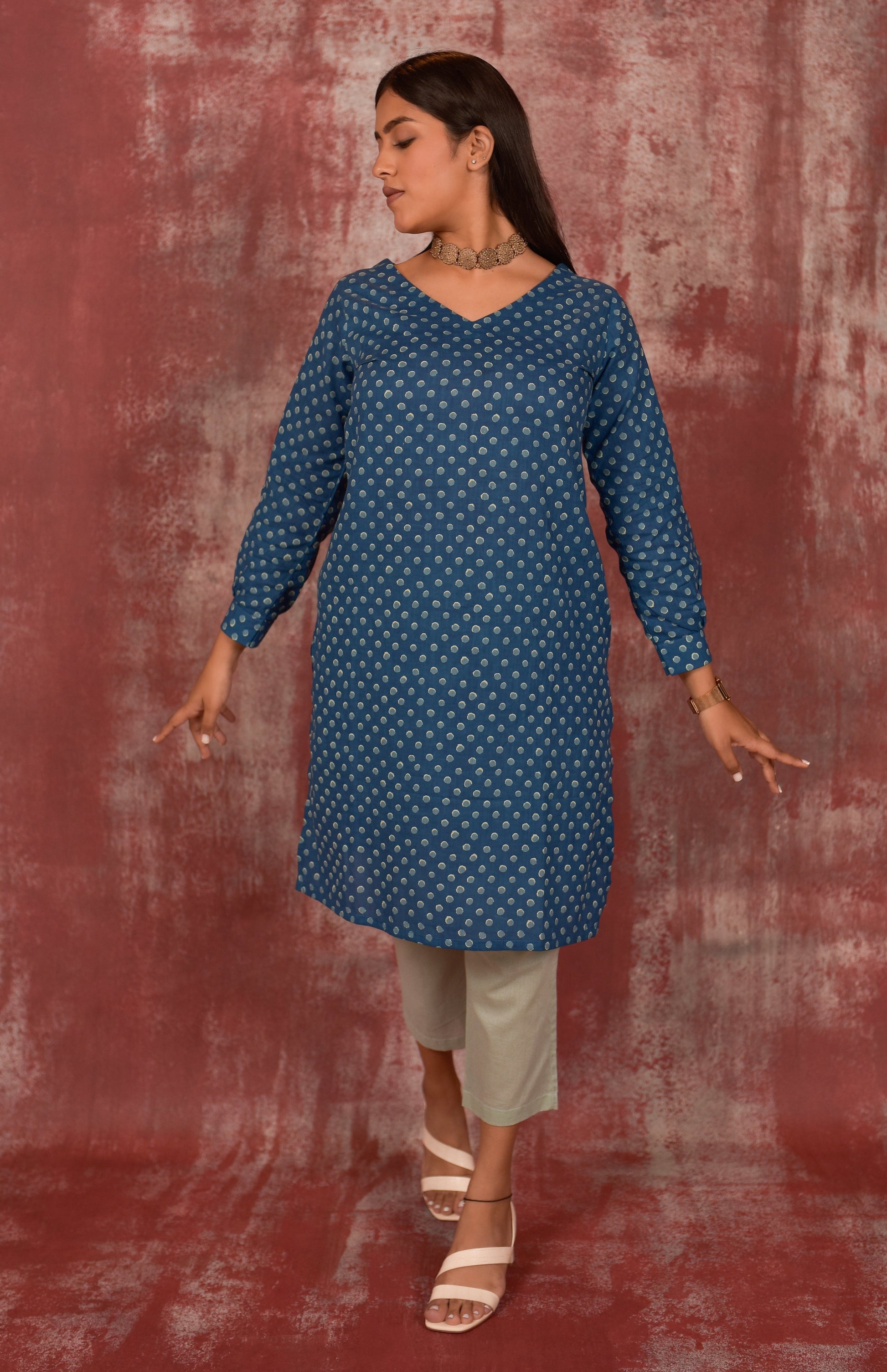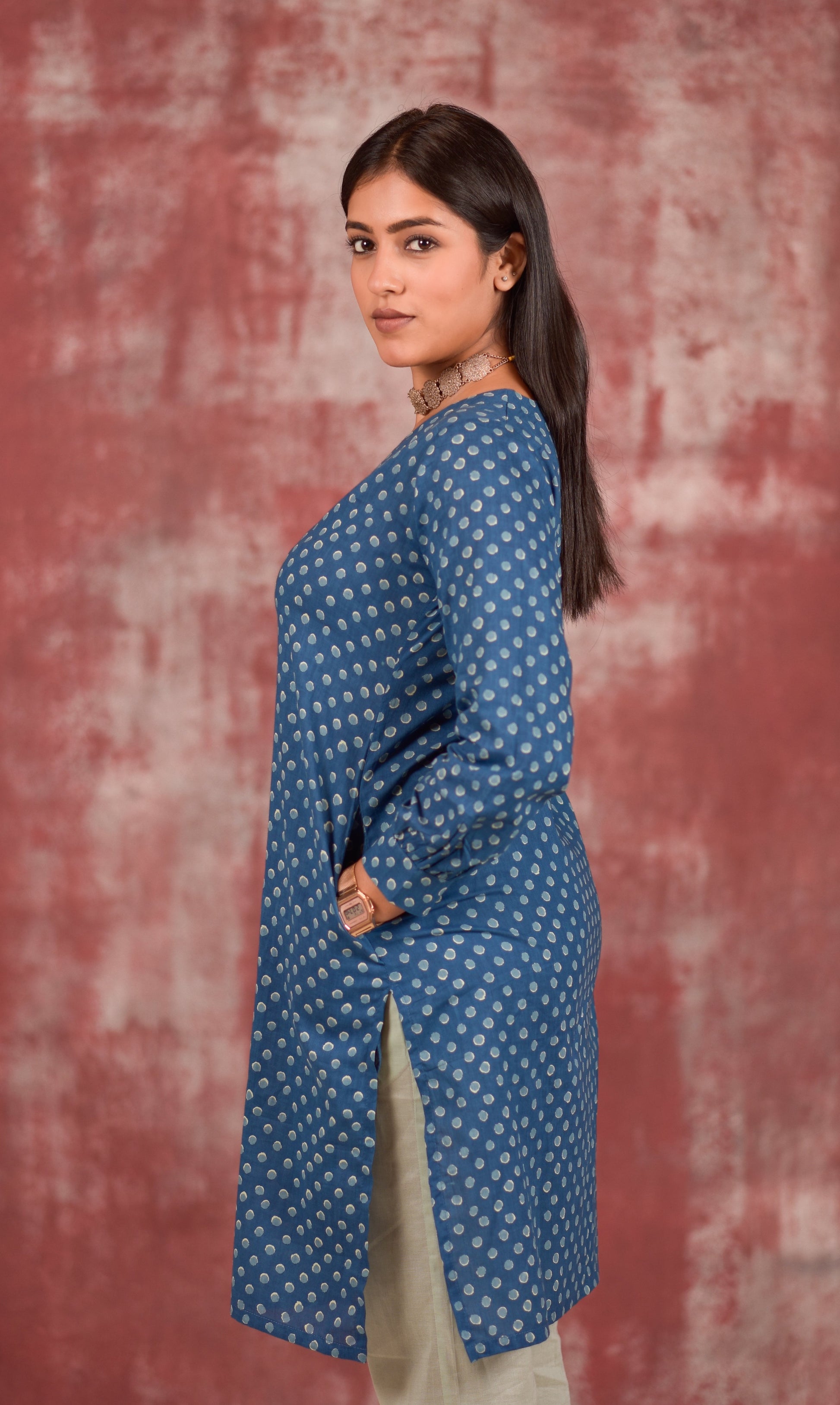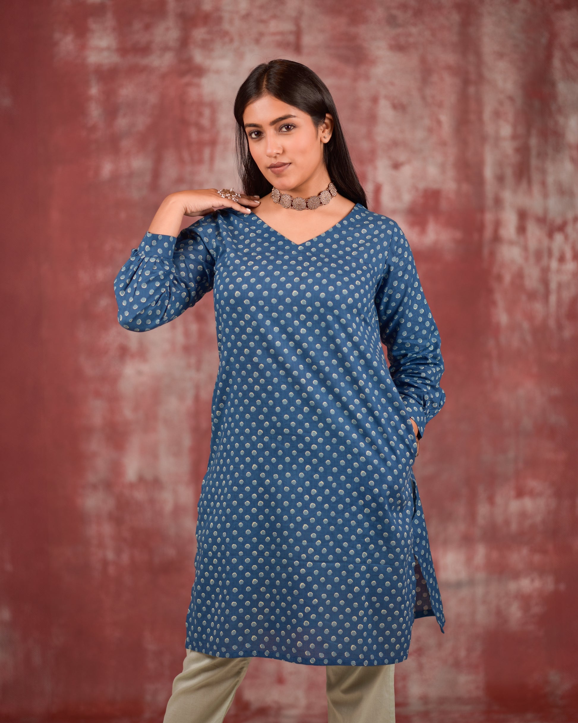 A gorgeous blue block printed co-ord set for your pre-festivite celebrations. This set of 2 is made in 100% cotton and is super comfortable to wear.