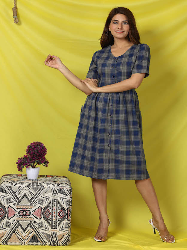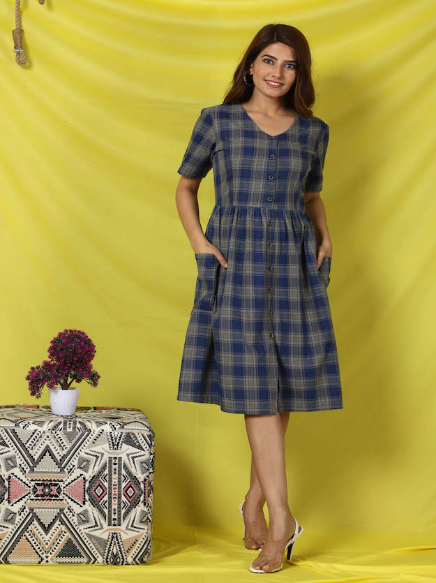 V-neck button-down checkered dress with a pleated look and pockets on the side. And yes it is 100% pure soft cotton. This dress is perfect for casual & semi-formal occasions.