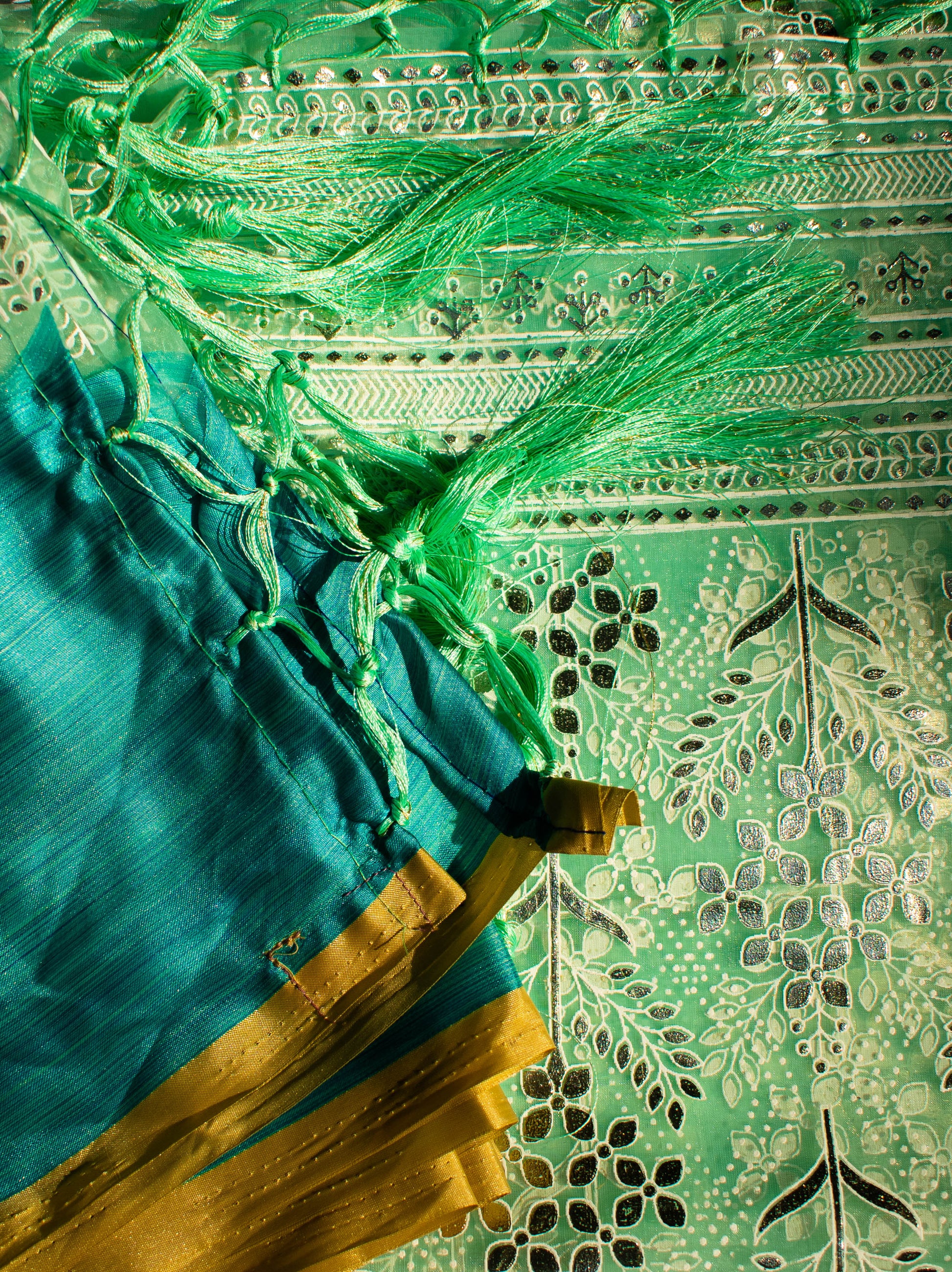 Gorgeous art silk dupattas with golden buttons weaved all over. Adorned with matching tassels for that perfect occasion wear look.