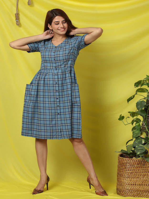 V-neck button-down checkered dress with a pleated look and pockets on the side. And yes it is 100% pure soft cotton. This dress is perfect for casual & semi-formal occasions.