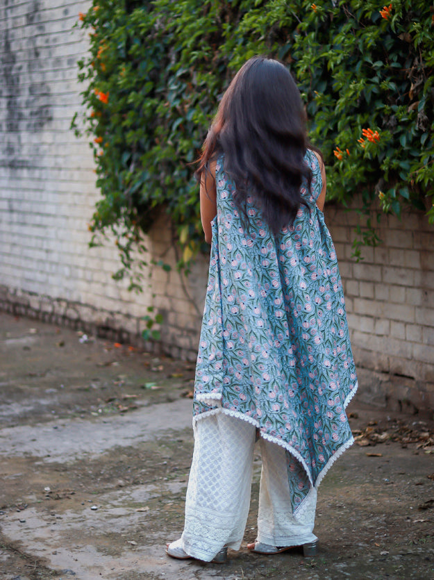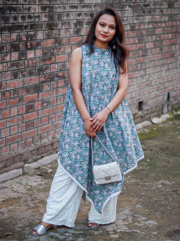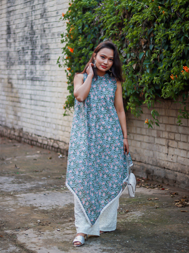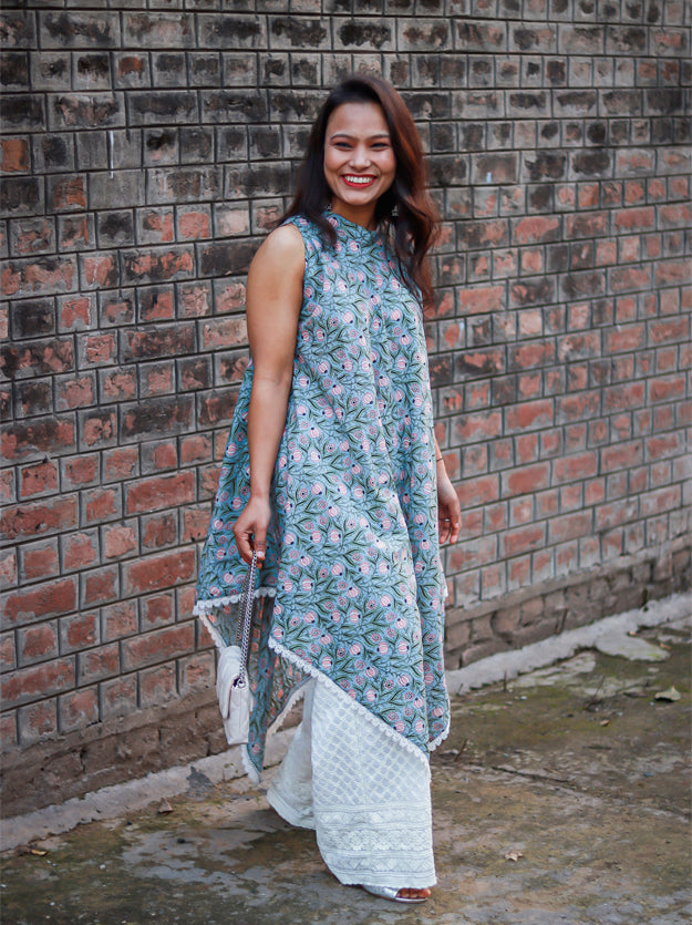 The gorgeous free size. kaftan is hand-screen printed by talented artisans in Sanganer, Rajasthan. The width of the kaftan is 40 inches at the chest making it a comfortable fit for sizes S-L.