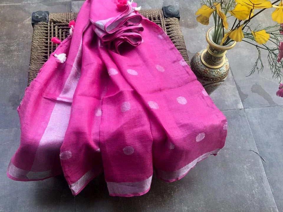 Silver zari border, zari butties, gorgeous yarn pom-poms and soothing pastel colour. All this on linen. That’s how you can describe this excquisite handmade dupatta. Straight from the artisans of bhagalpur, this dupatta is perfect addition to your monsoon, autums, festive, pre-festive - just anytime wardrobe.