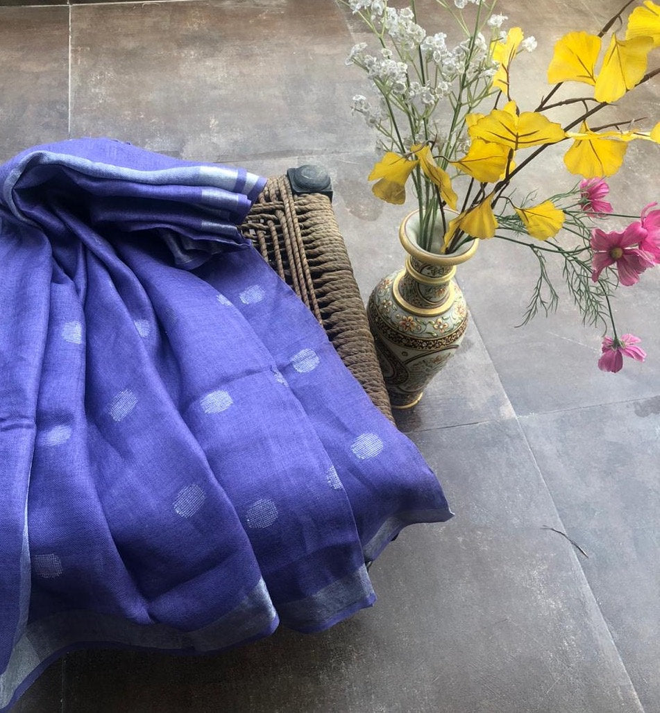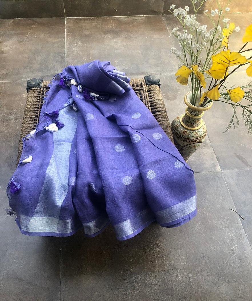Silver zari border, zari butties, gorgeous yarn pom-poms and soothing pastel colour. All this on linen. That’s how you can describe this excquisite handmade dupatta. Straight from the artisans of bhagalpur, this dupatta is perfect addition to your monsoon, autums, festive, pre-festive - just anytime wardrobe.