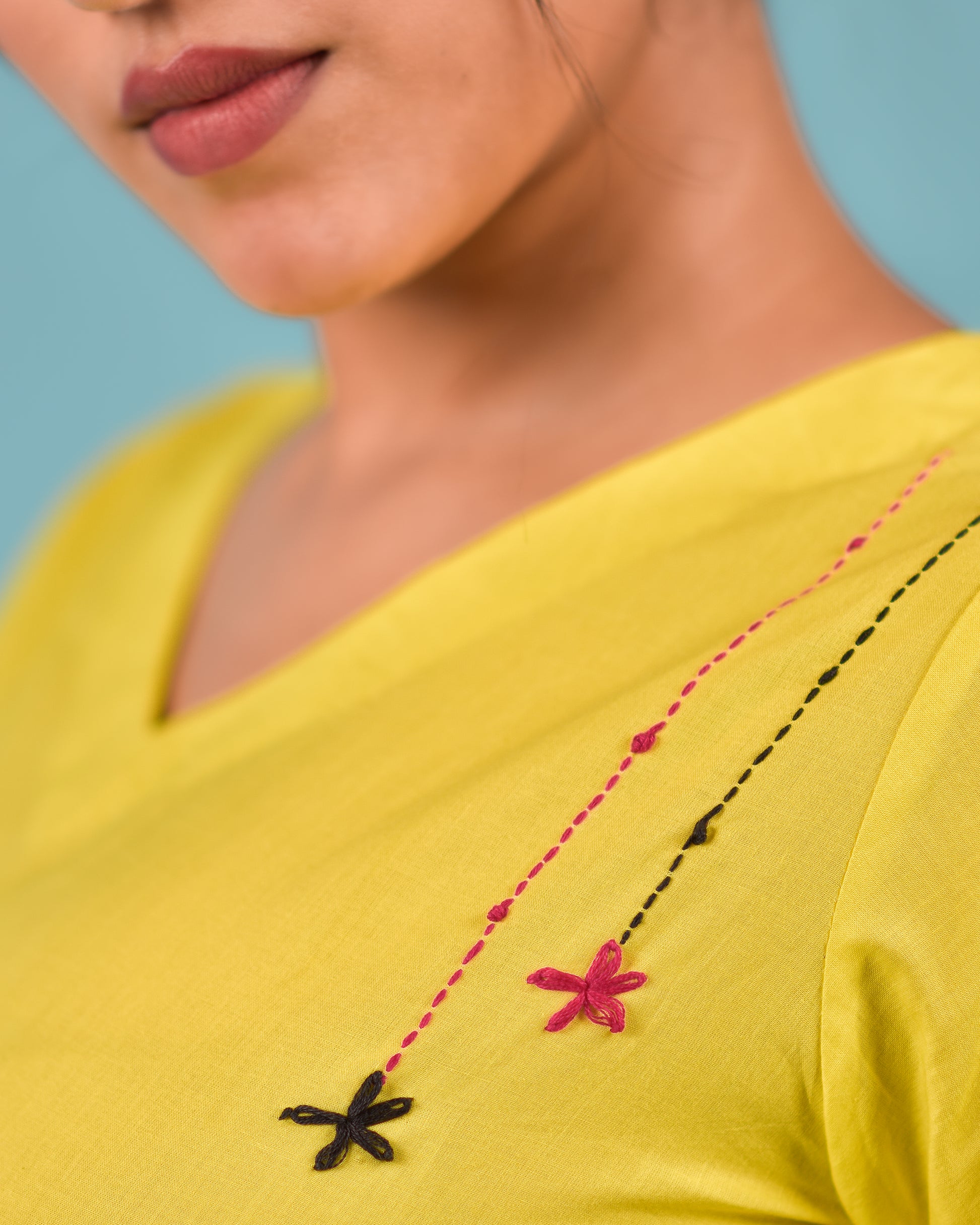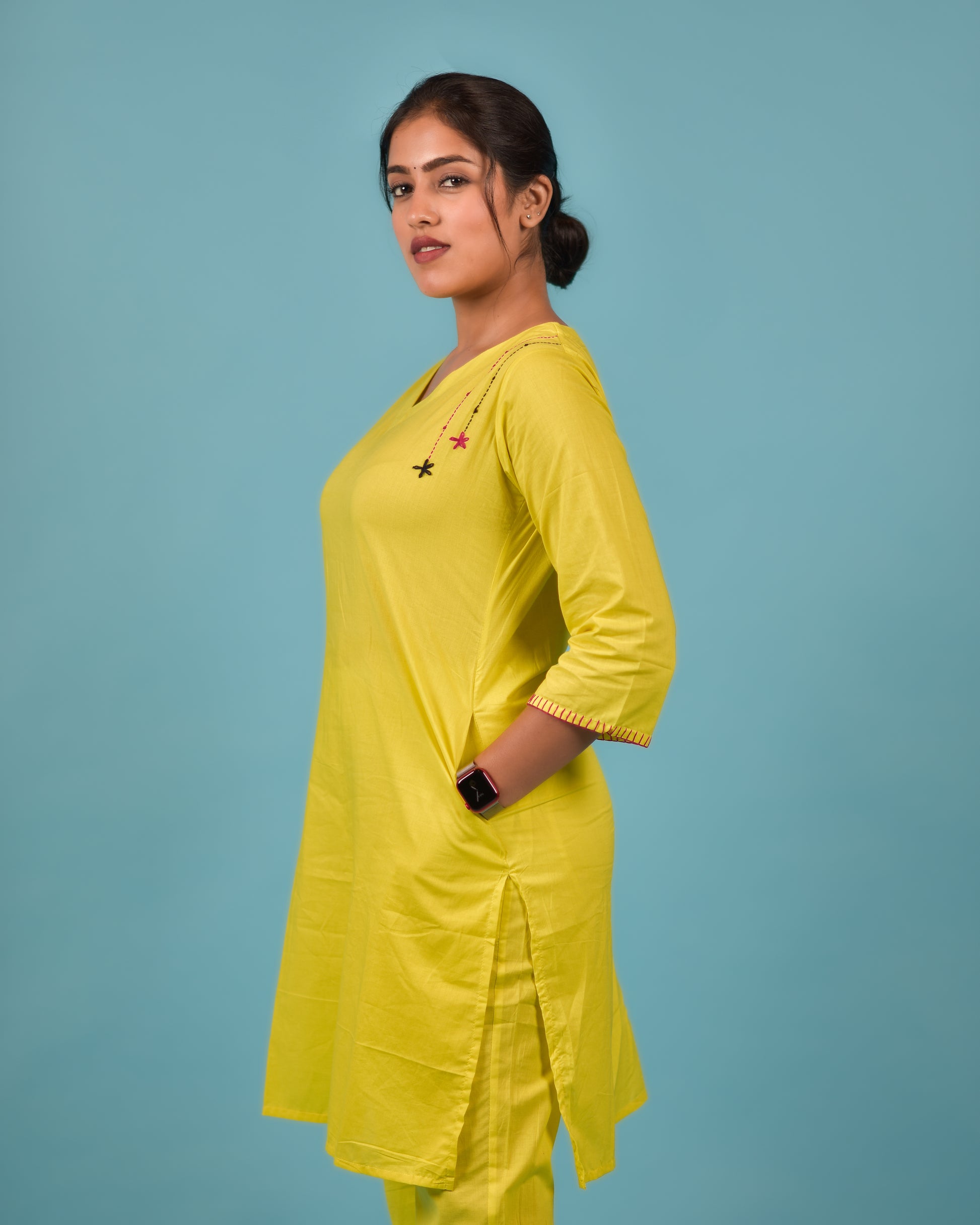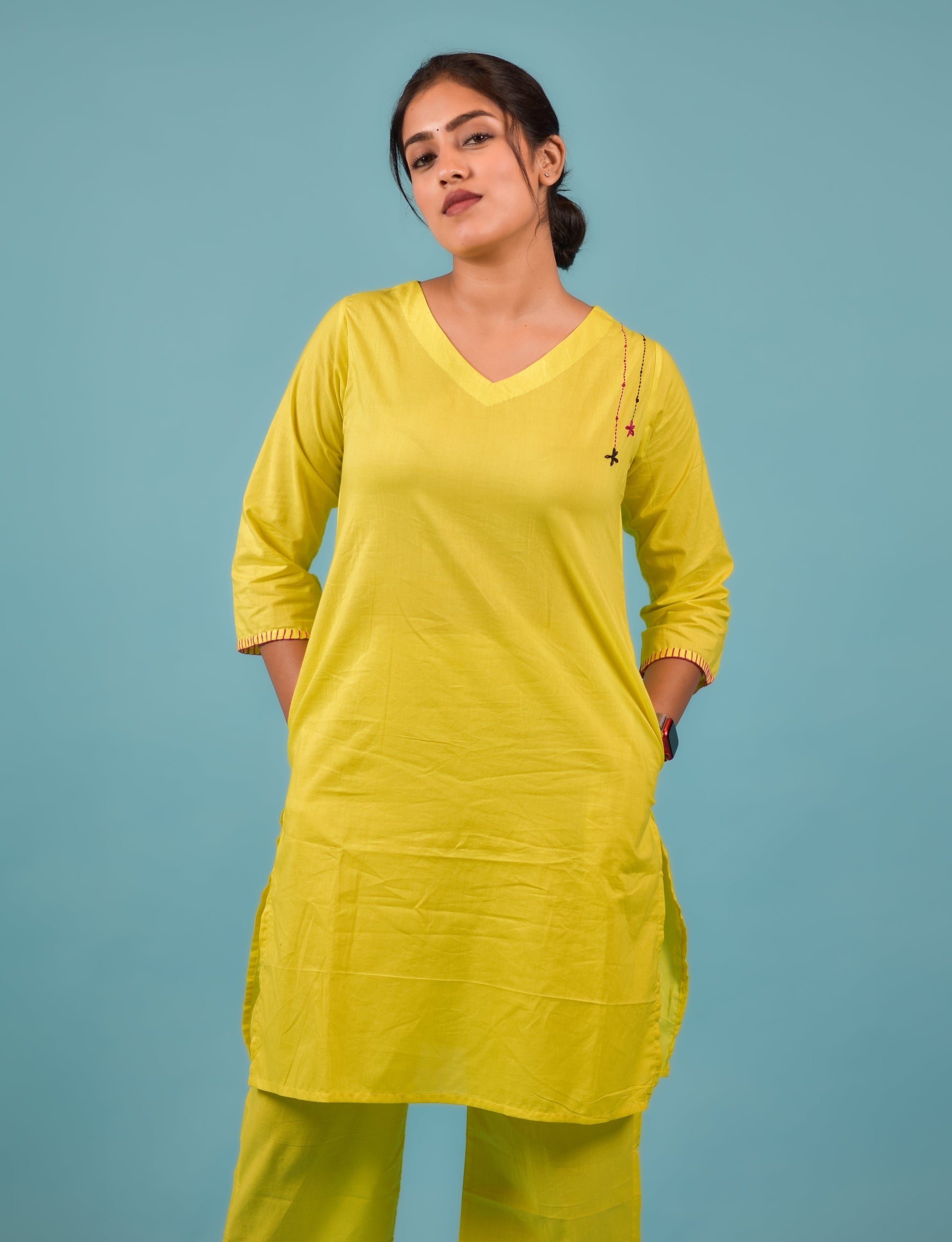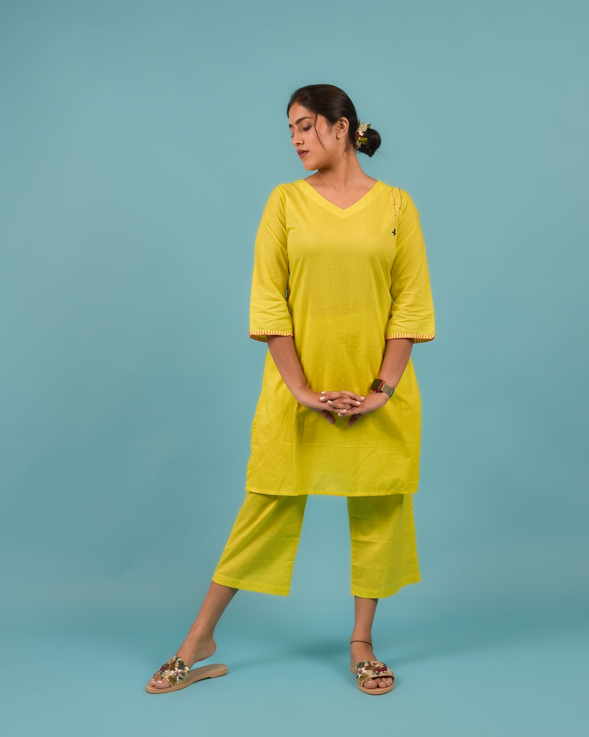 A gorgeous bright lime yellow/green co-ord set for your pre-festivite celebrations. This set of 2 is made in 100% cotton and is super comfortable to wear.