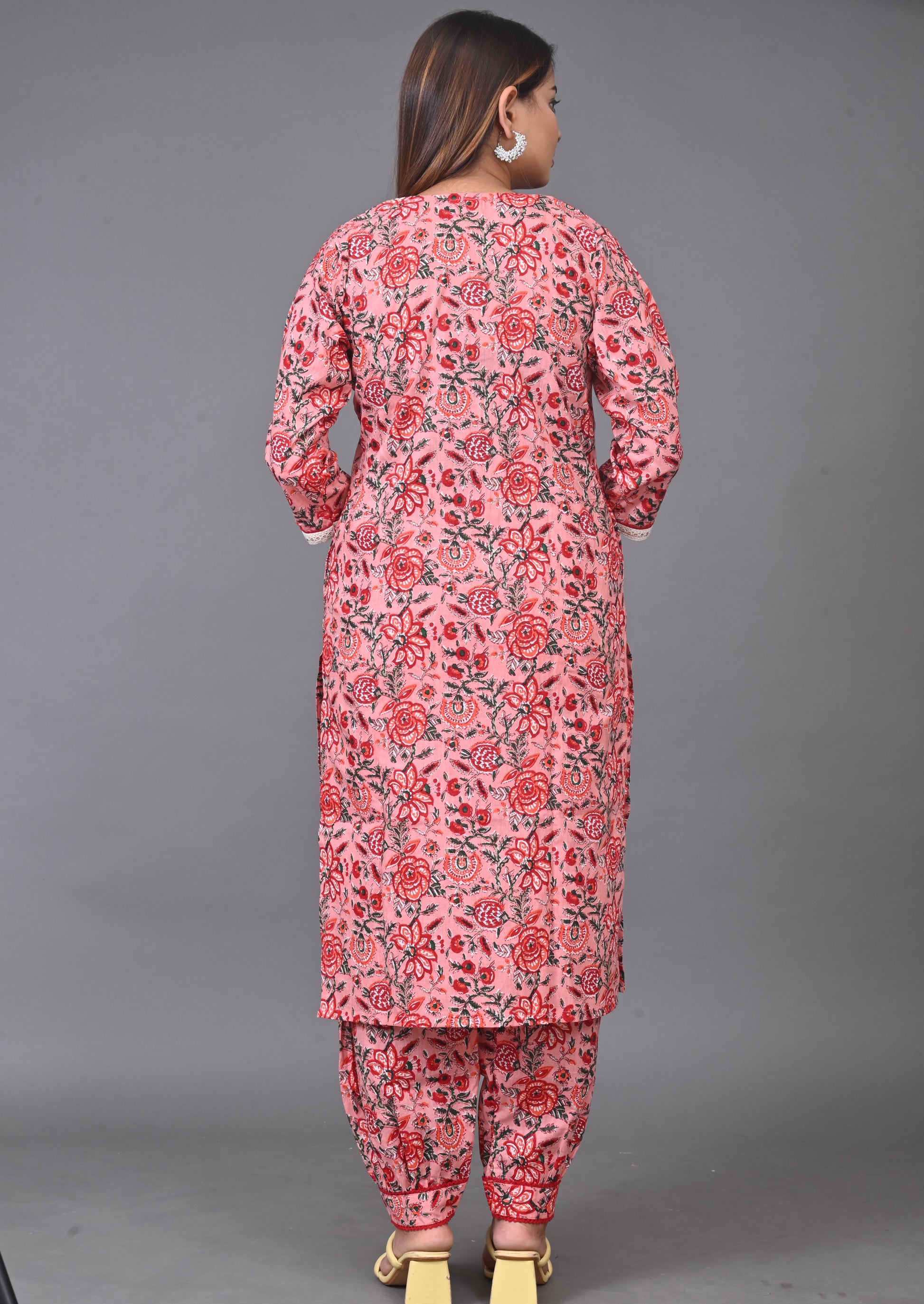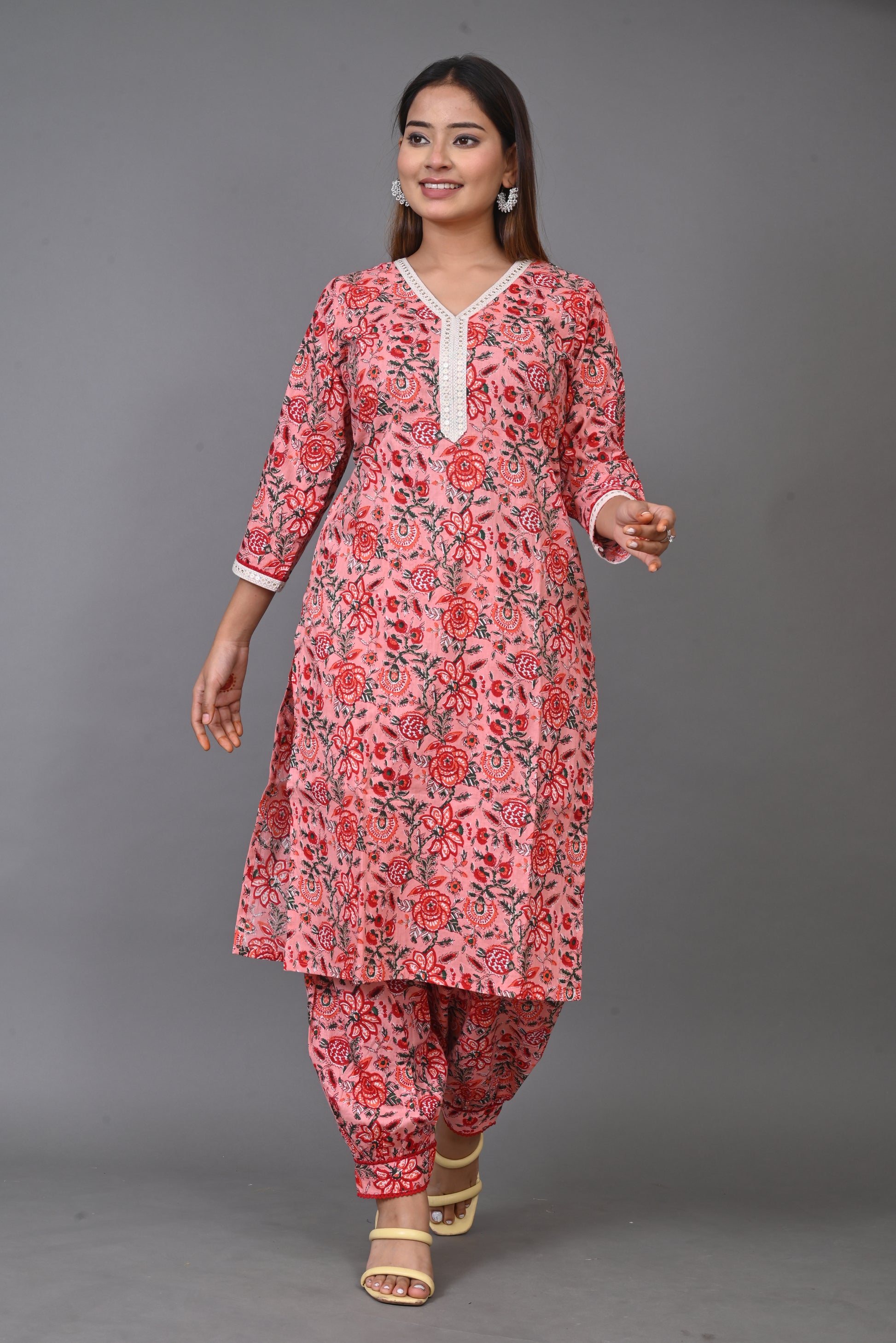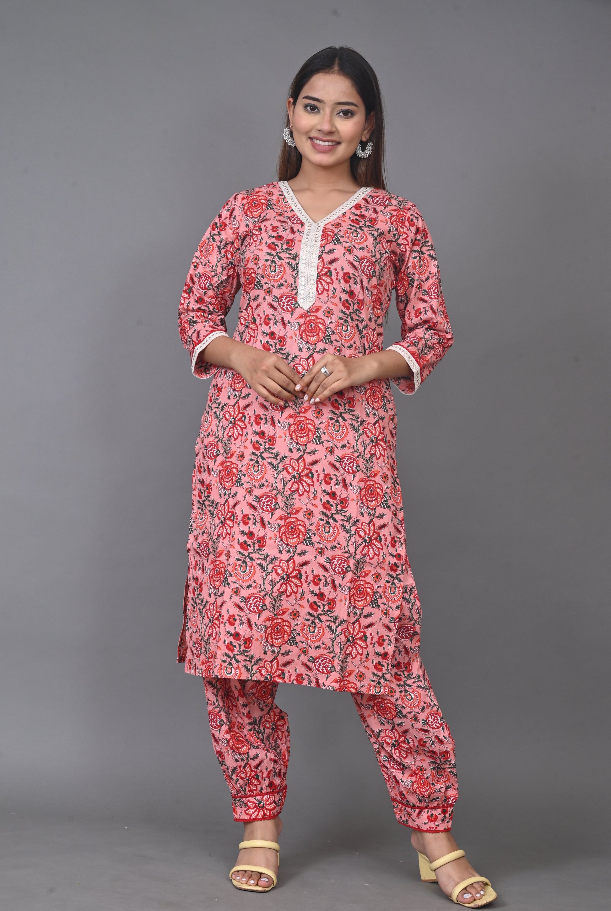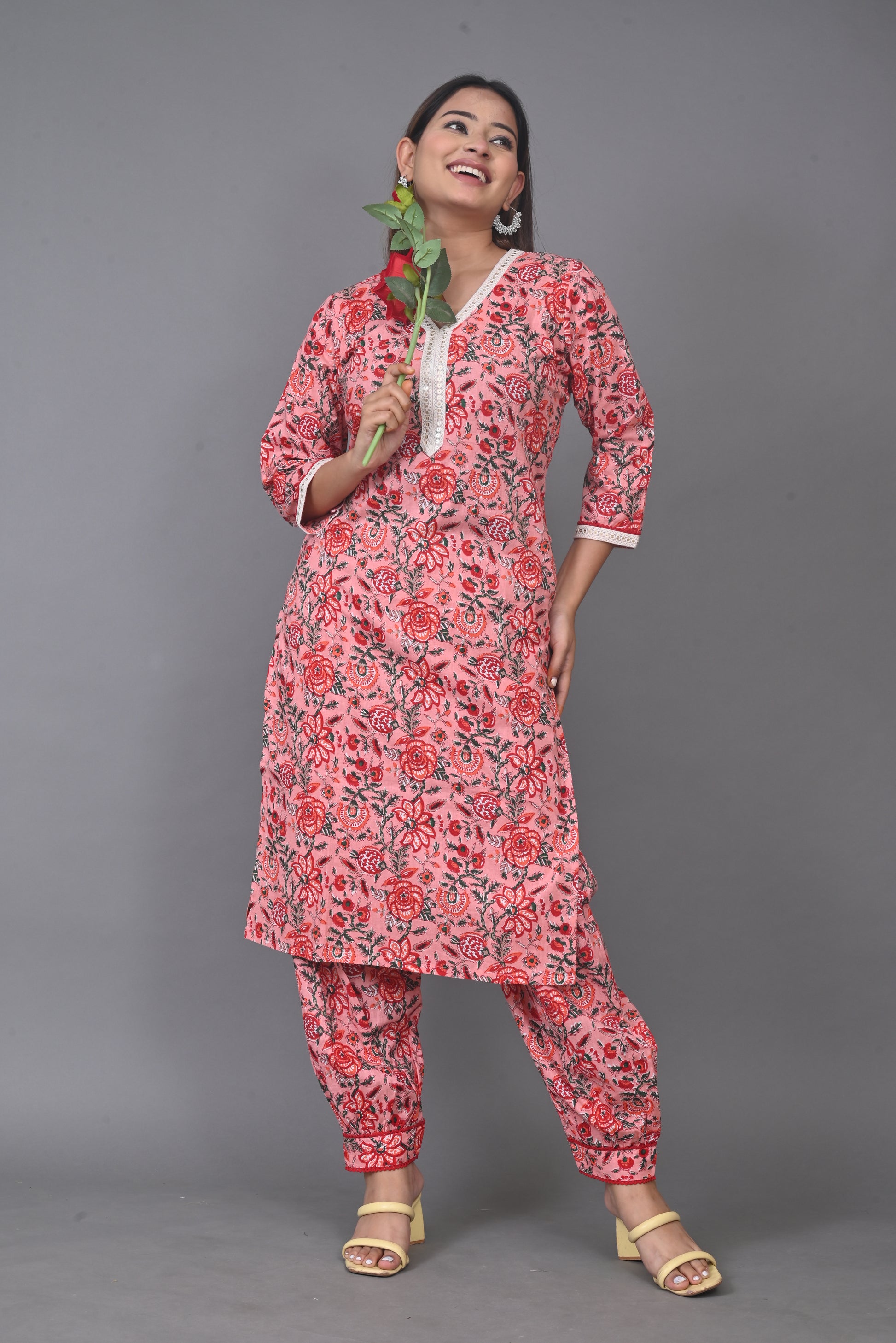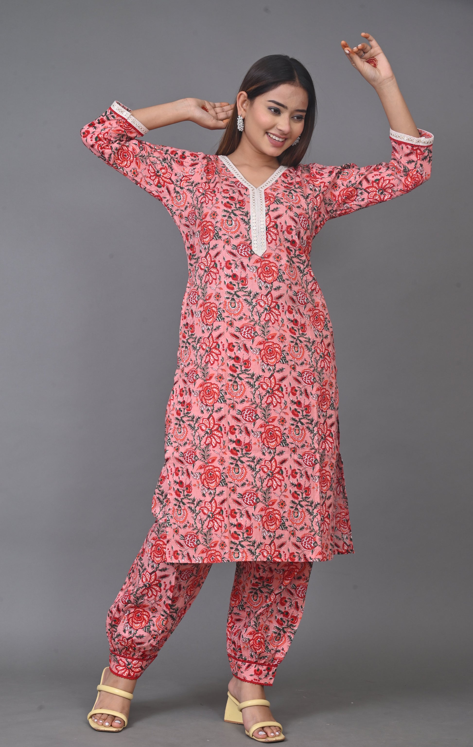 A gorgeous red block printed co-ord set for that chic look. This set of 2 is made in 100% cotton and is super comfortable to wear. Accented with gorgeous laces and pathani style, this set is sure to elevate your festive look.