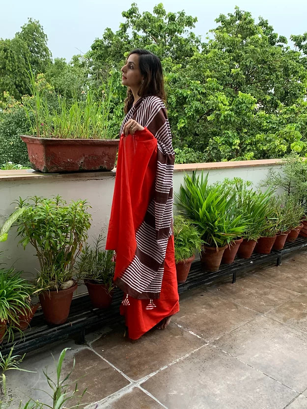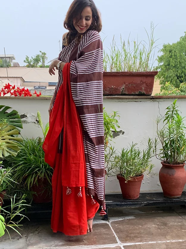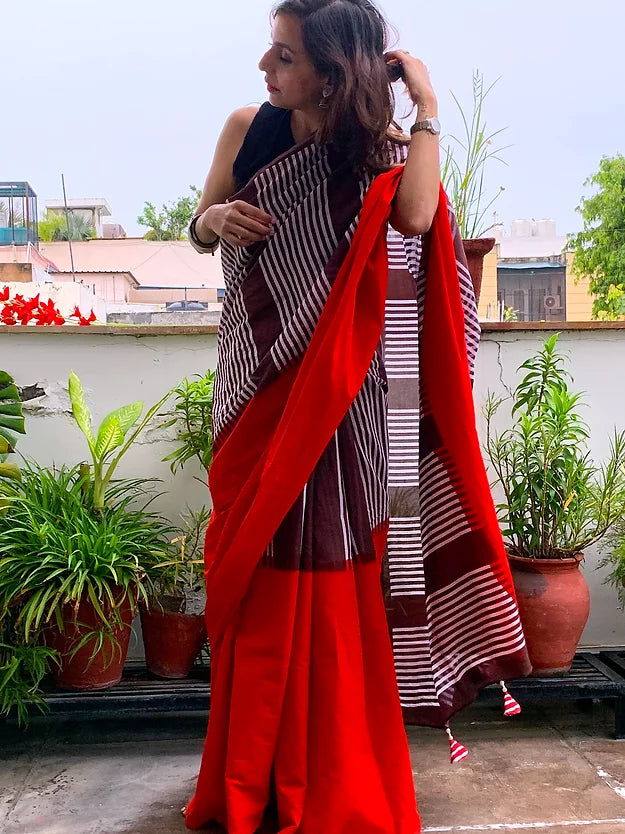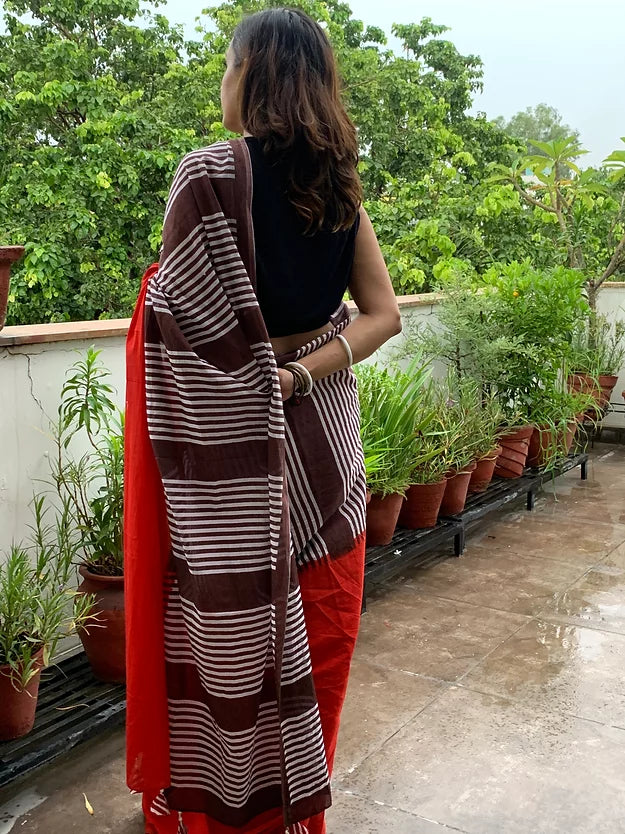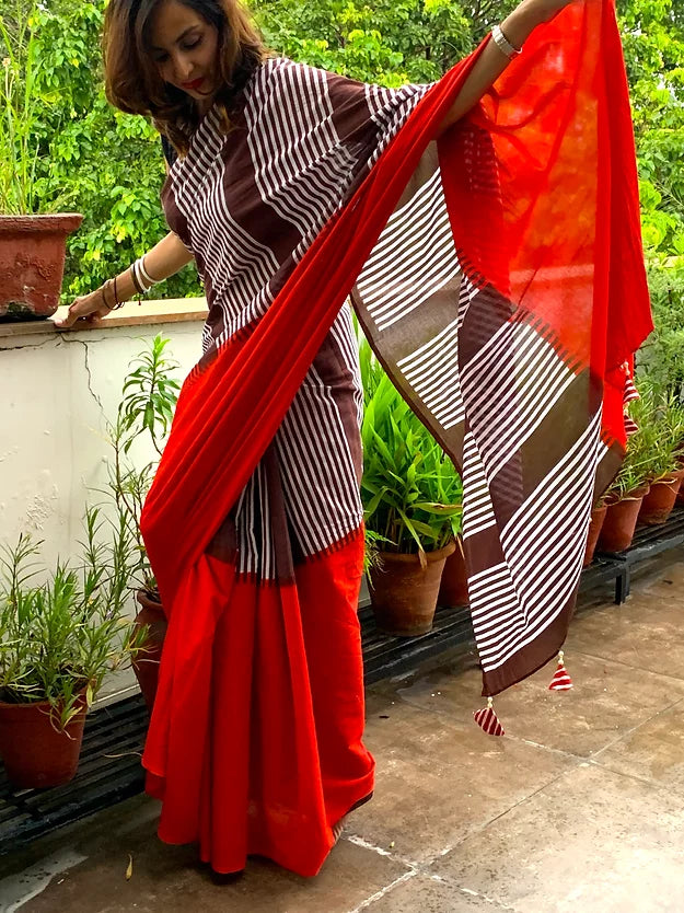 Dual shade hand-screen printed red and brown saree with white stripes. Lightweight cotton mulmul saree made with love by artisans from Sanganer, Rajasthan.