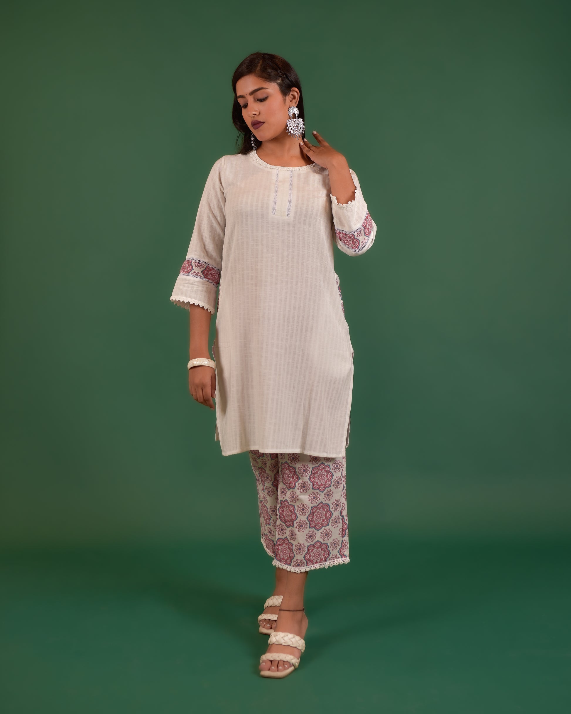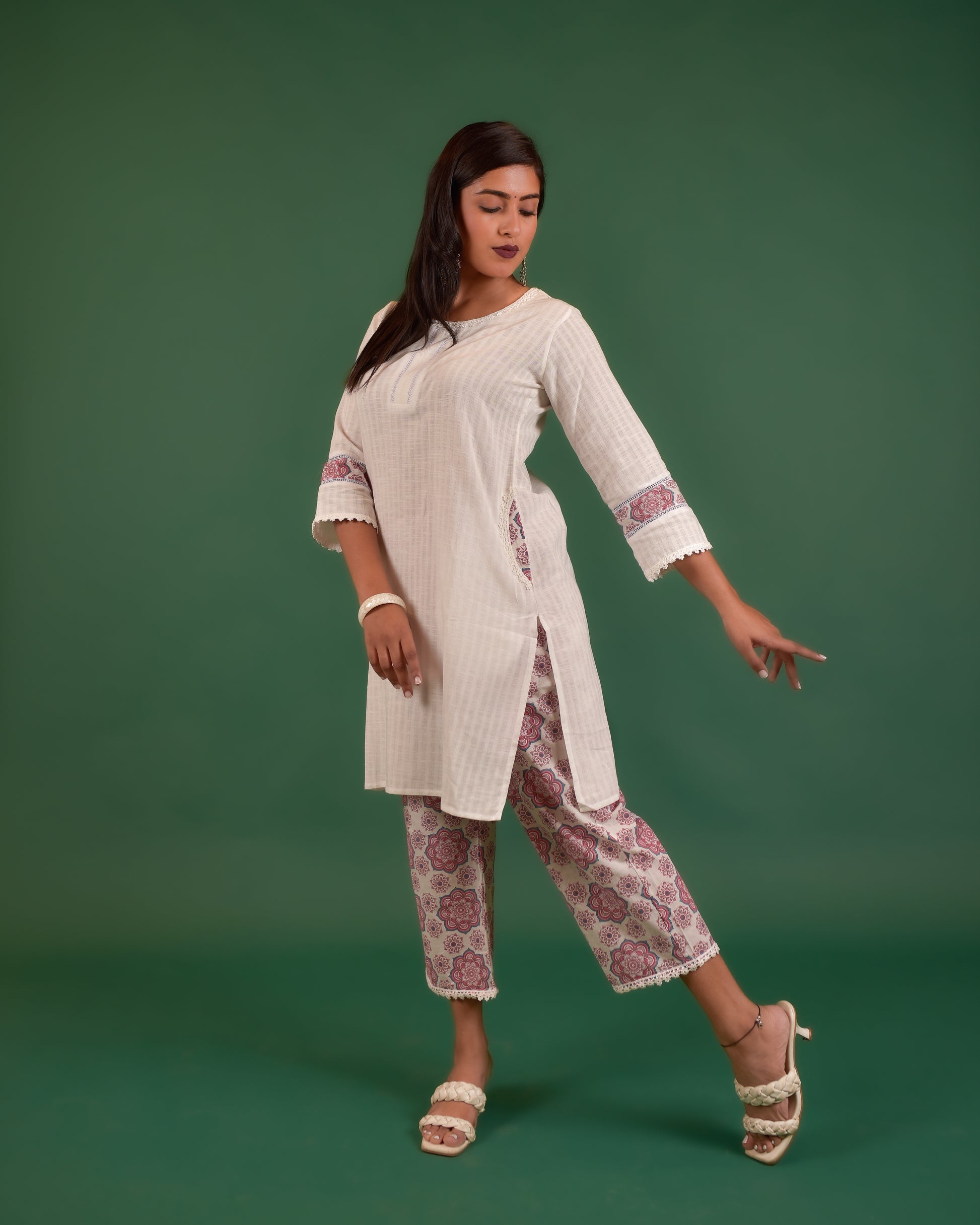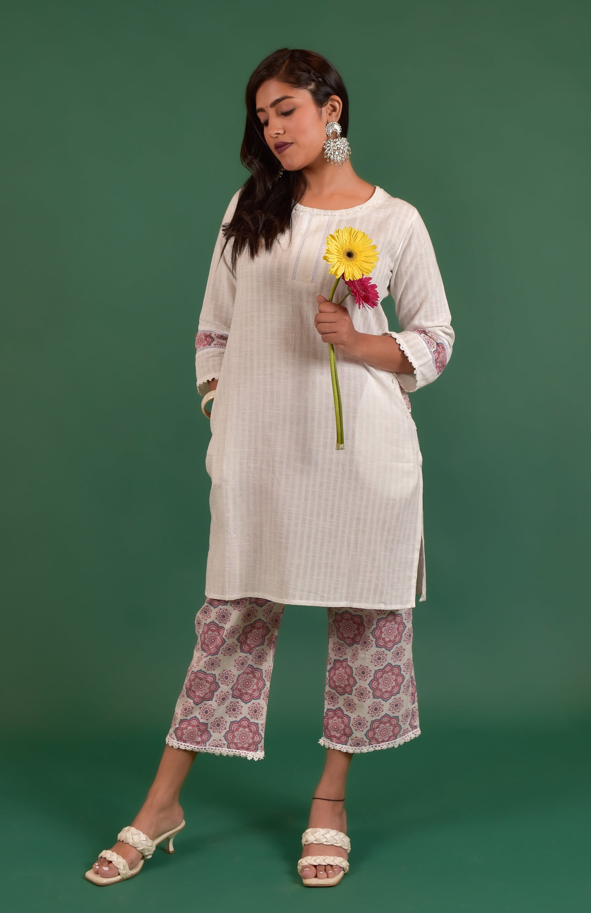 A gorgeous self design white kurta matched with beautiful block printed pants. This set of 2 is made in 100% cotton and is super comfortable to wear.