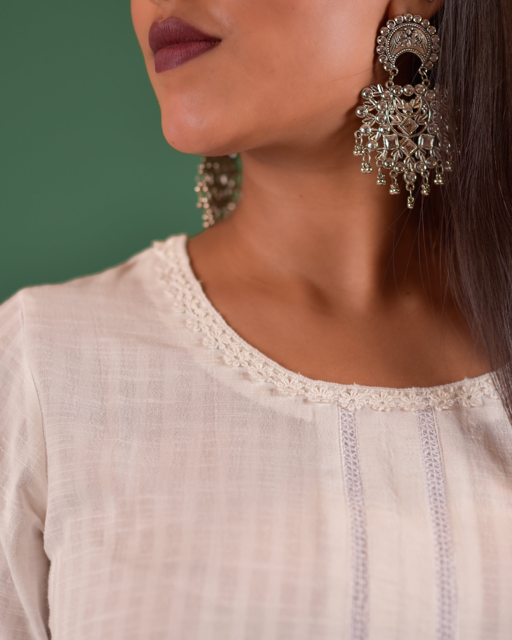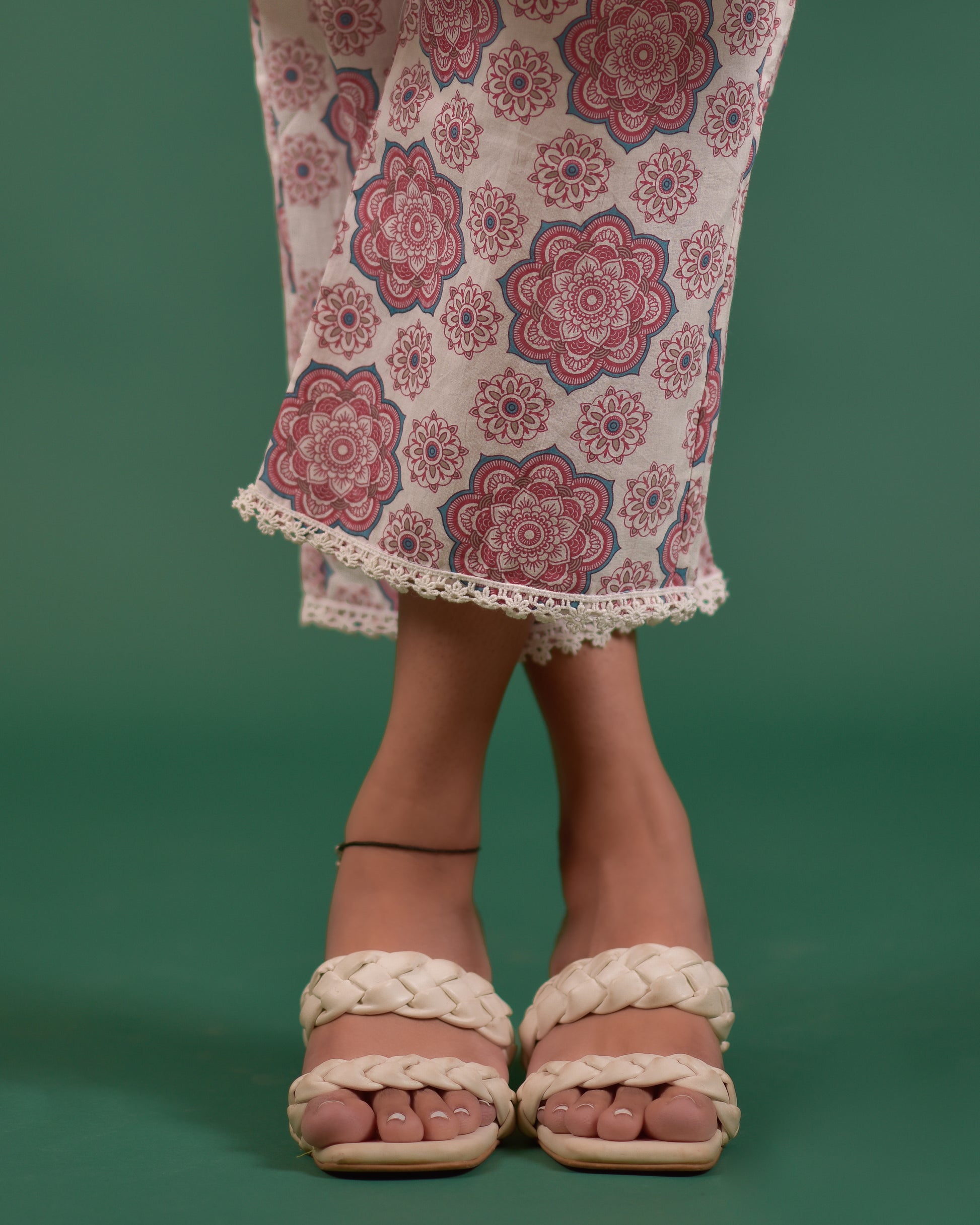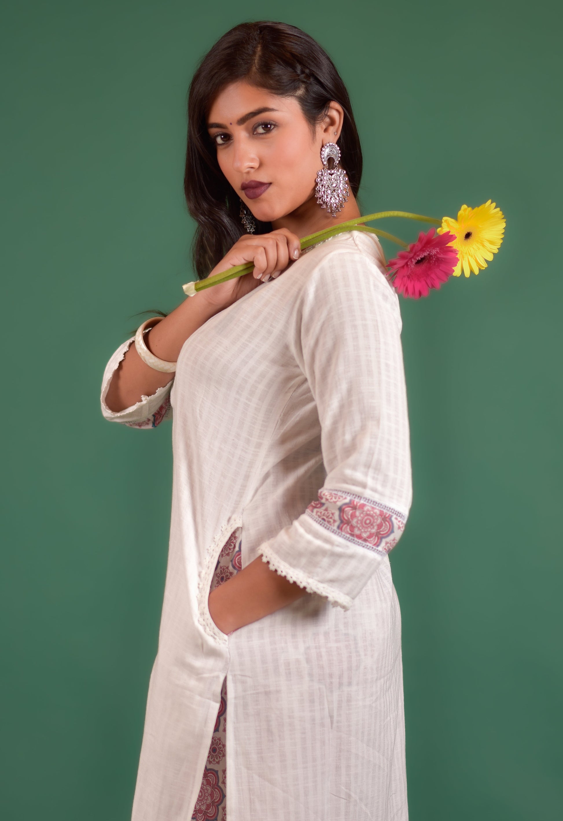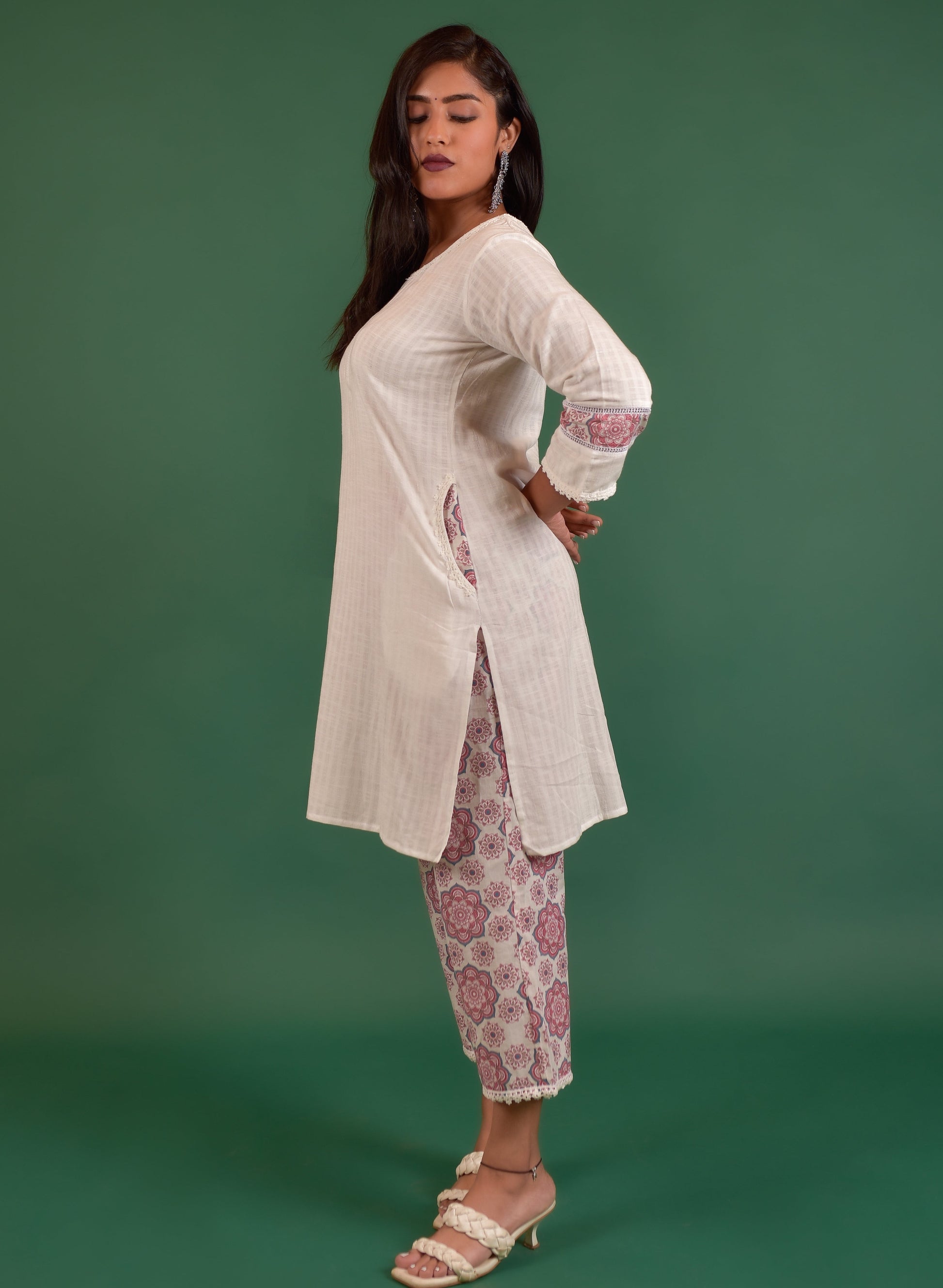 A gorgeous self design white kurta matched with beautiful block printed pants. This set of 2 is made in 100% cotton and is super comfortable to wear.