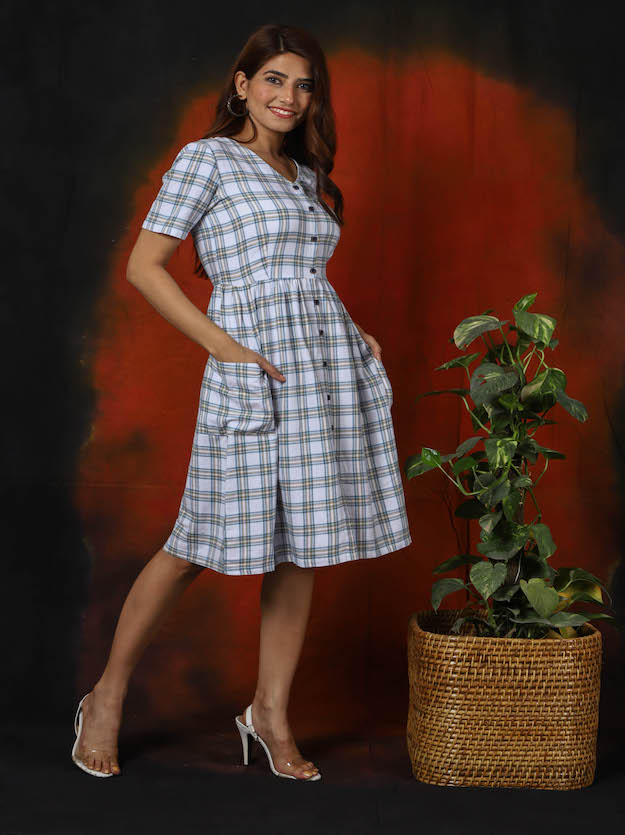 V-neck button-down checkered dress with pleated look and pockets on the side. And yes it is 100% pure soft cotton. This dress is perfect for casual & semi-formal occasions.