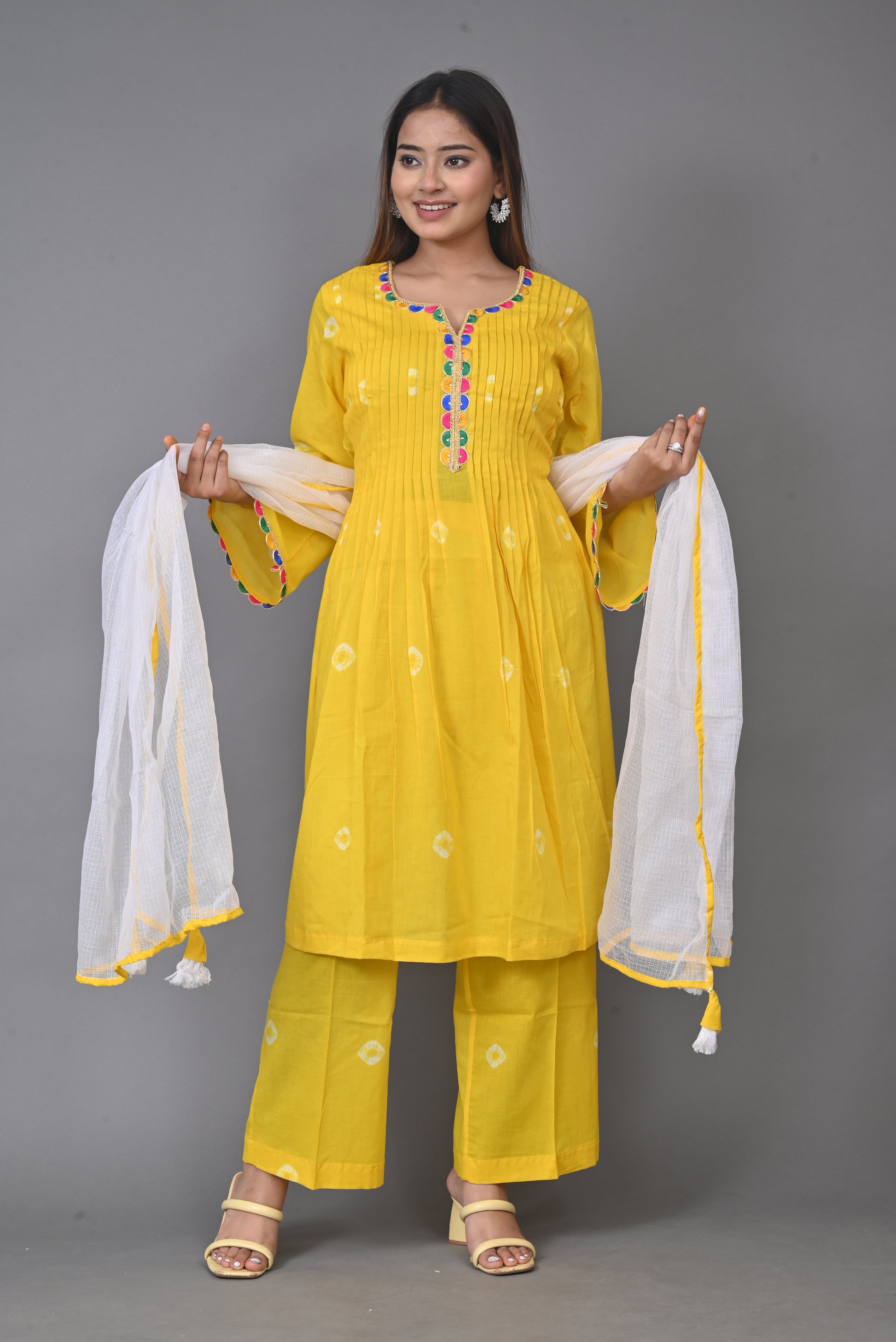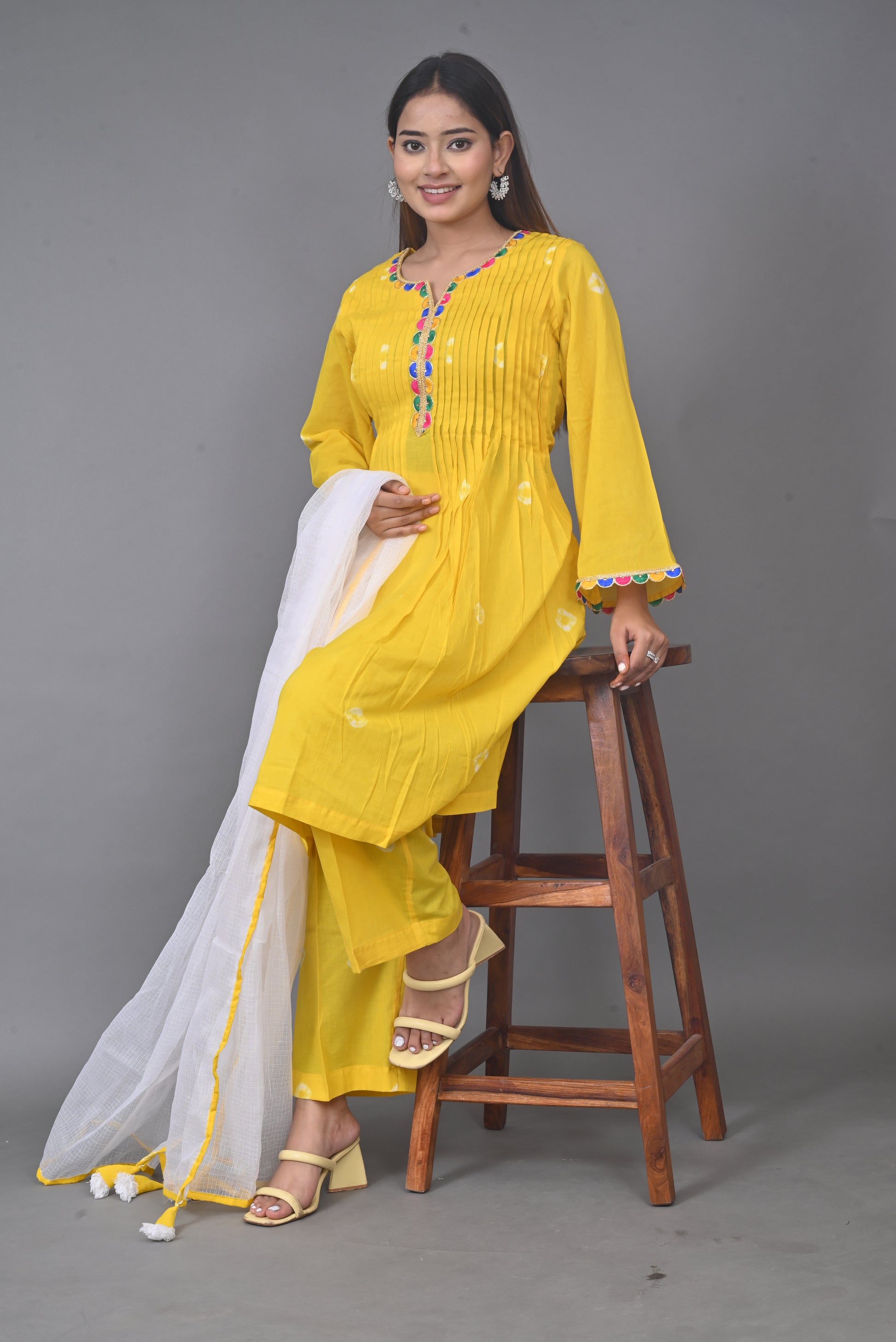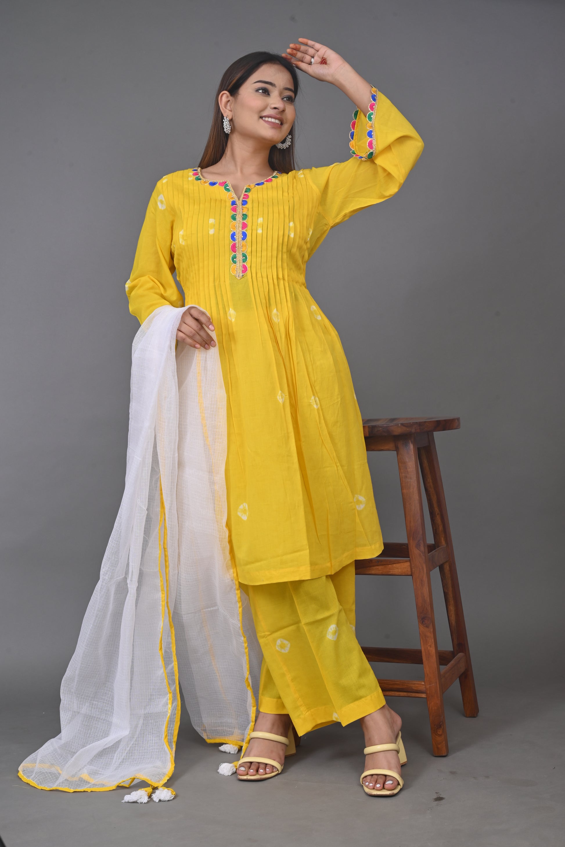 A gorgeous block printed kurta set in comfortable mul fabric. This set of 3 is made in 100% cotton and is super comfortable to wear. Accented with gorgeous laces and pituck style, this set is sure to elevate your festive look.