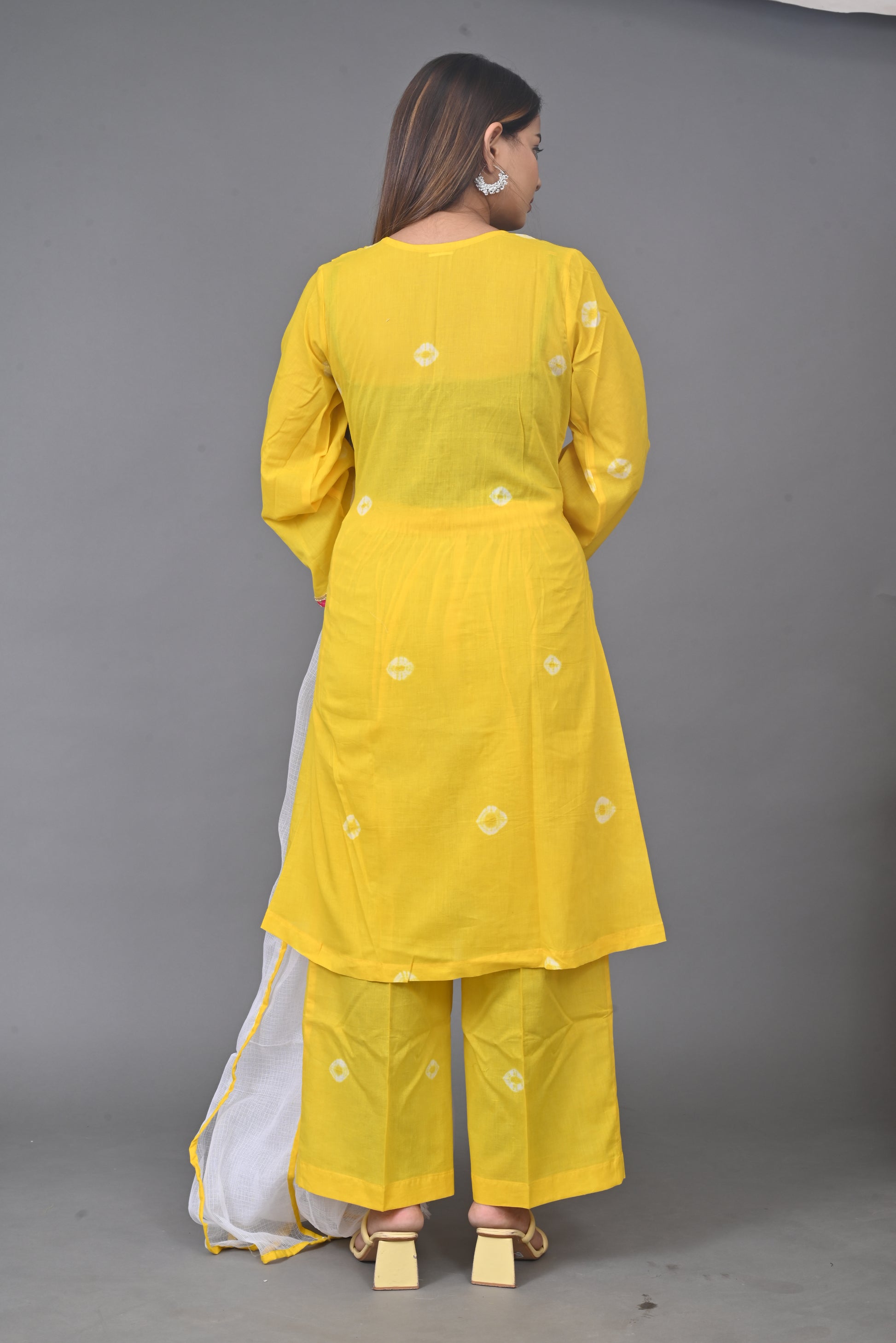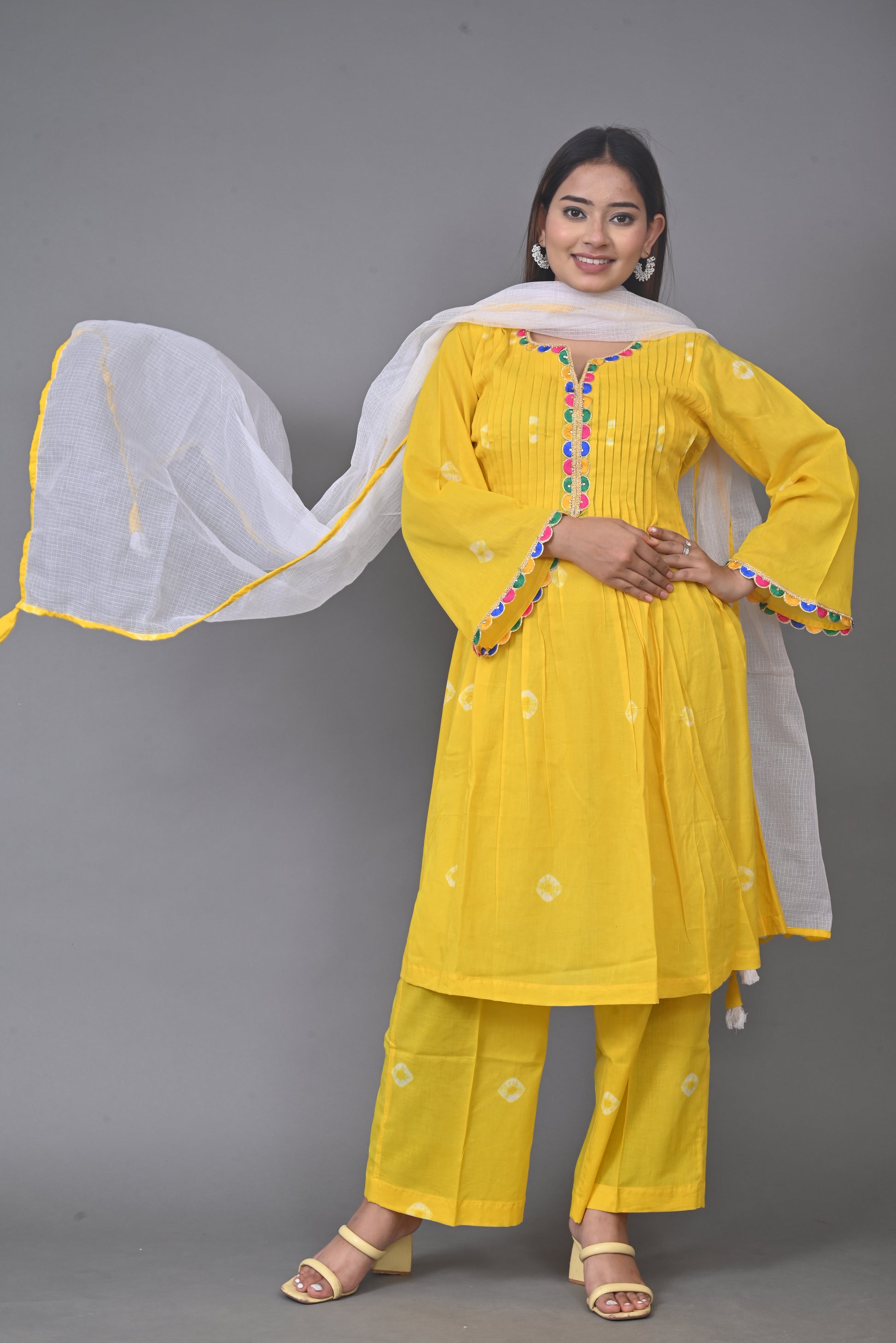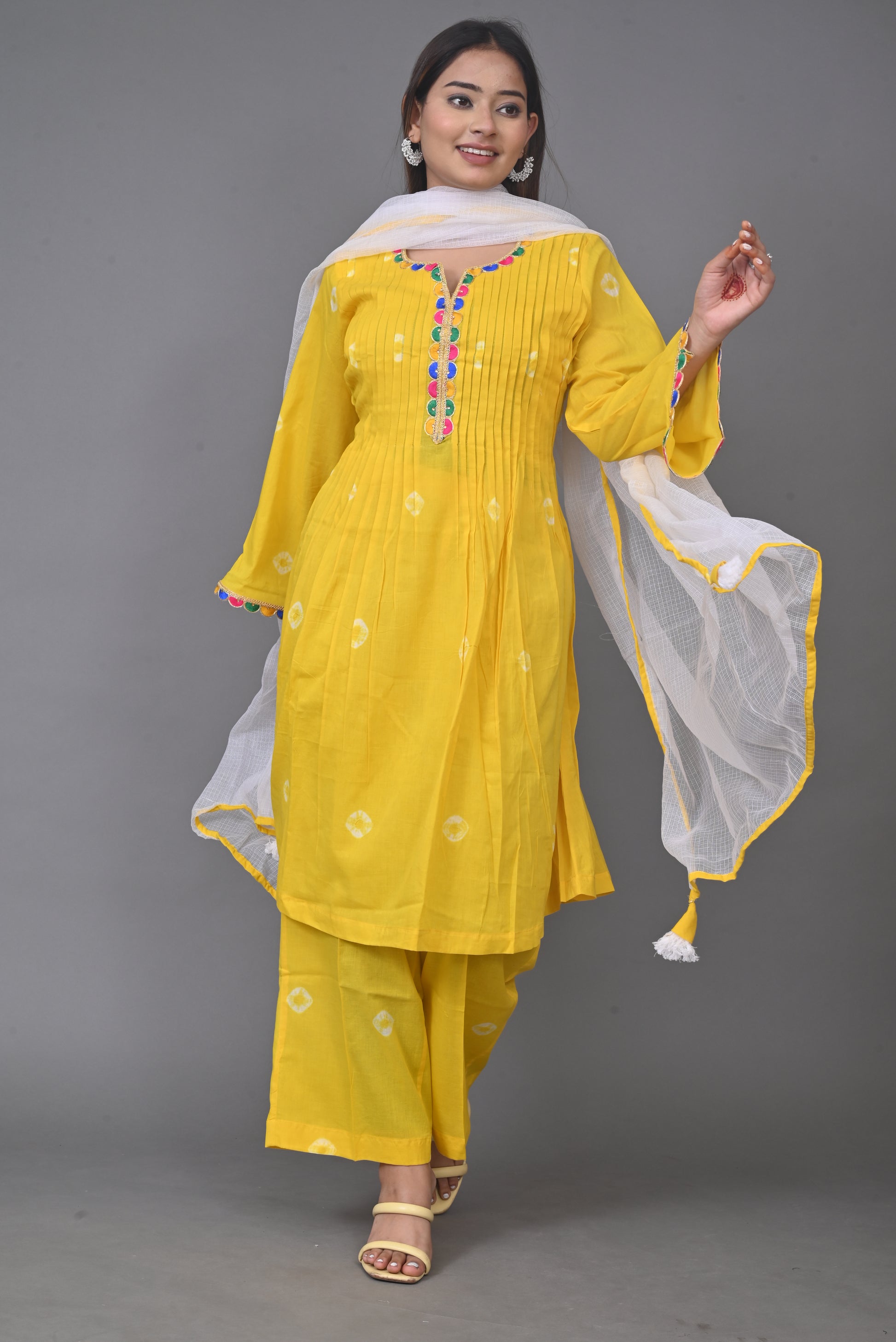 A gorgeous block printed kurta set in comfortable mul fabric. This set of 3 is made in 100% cotton and is super comfortable to wear. Accented with gorgeous laces and pituck style, this set is sure to elevate your festive look.
