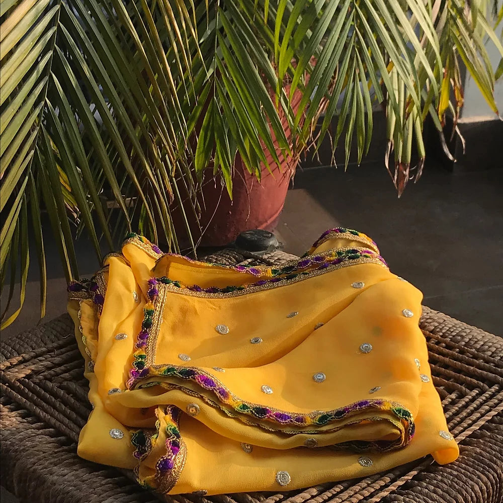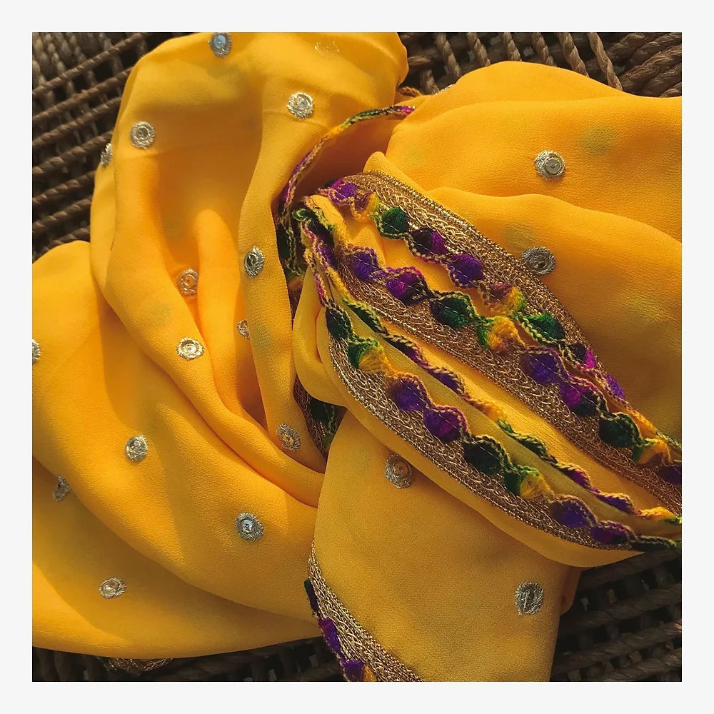 A gorgeous yellow georgette dupatta with all over embellishments. Adorned with a contrasting purple and yellow lace, the dupatta is perfect for occasion wear.